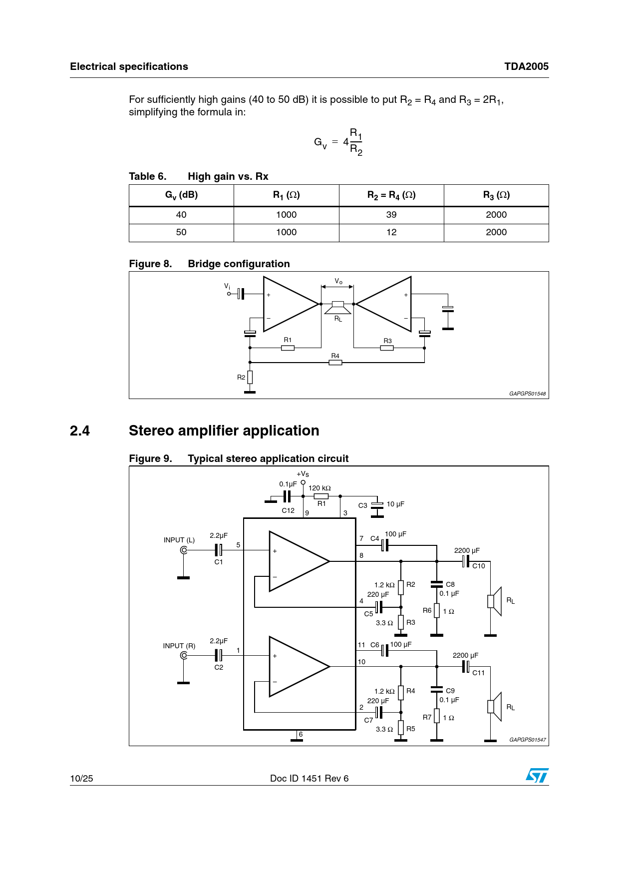 Electrical specificationsTDA2005 For sufficiently high gains (40 to 50 dB) it is possible to put R2 = R4 and R3 = 2R1, simplifying the formula in: R1 G = 4---- v R2 Table 6.High gain vs. RxGv (dB)R1 ()R2 = R4 ()R3 () 40 1000 39 2000 50 1000 12 2000 Figure 8.Bridge configuration 6O 6I n 2 n , 2 2 2 2 '!0'03 2.4 StereoamplifierapplicationFigure 9.Typical stereo application circuit 6S & 2 # # & ).054 # # # n 2 # 2, # 2 2 & ).054 # # # n 2 # 2, # 2 2 '!0'03 10/25 Doc ID 1451 Rev 6 Document Outline Table 1. Device summary 1 Schematic and pins connection diagrams Figure 1. Schematic diagram Figure 2. Pins connection diagram (top view) 2 Electrical specifications 2.1 Absolute maximum ratings Table 2. Absolute maximum ratings 2.2 Thermal data Table 3. Thermal data 2.3 Bridge amplifier section Figure 3. Test and application circuit (bridge amplifier) Figure 4. PC board and components layout of Figure 3 2.3.1 Electrical characteristics (bridge application) Table 4. Electrical characteristics (bridge application) Figure 5. Output offset voltage vs. supply voltage Figure 6. Distortion vs. output power (RL = 4 W) Figure 7. Distortion vs. output power (RL = 3.2 W) 2.3.2 Bridge amplifier design Table 5. Bridge amplifier design Table 6. High gain vs. Rx Figure 8. Bridge configuration 2.4 Stereo amplifier application Figure 9. Typical stereo application circuit 2.4.1 Electrical characteristics (stereo application) Table 7. Electrical characteristics (stereo application) Figure 10. Quiescent output voltage vs. supply voltage (stereo amplifier) Figure 11. Quiescent drain current vs. supply voltage (stereo amplifier) Figure 12. Distortion vs. output power (stereo amplifier) Figure 13. Output power vs. supply voltage, RL = 2 and 4 W (stereo amplifier) Figure 14. Output power vs. supply voltage, RL = 1.6 and 3.2 W (stereo amplifier) Figure 15. Distortion vs. frequency, RL = 2 and 4 W (stereo amplifier) Figure 16. Distortion vs. frequency, RL = 1.6 and 3.2 W (stereo amplifier) Figure 17. Supply voltage rejection vs. C3 (stereo amplifier) Figure 18. Supply voltage rejection vs. frequency (stereo amplifier) Figure 19. Supply voltage rejection vs. C2 and C3, GV = 390/1 W (stereo amplifier) Figure 20. Supply voltage rejection vs. C2 and C3, GV = 1000/10 W (stereo amplifier) Figure 21. Gain vs. input sensitivity RL = 4 W (stereo amplifier) Figure 22. Gain vs. input sensitivity RL = 2 W (stereo amplifier) Figure 23. Total power dissipation and efficiency vs. output power (bridge) Figure 24. Total power dissipation and efficiency vs. output power (stereo) 3 Application suggestion Table 8. Recommended values of the component of the bridge application circuit 4 Application information Figure 25. Bridge amplifier without boostrap Figure 26. PC board and components layout of Figure 25 Figure 27. Low cost bridge amplifier (GV = 42 dB) Figure 28. PC board and components layout of Figure 27 Figure 29. 10 + 10 W stereo amplifier with tone balance and loudness control Figure 30. Tone control response (circuit of Figure 29) Figure 31. 20 W bus amplifier Figure 32. Simple 20 W two way amplifier (FC = 2 kHz) Figure 33. Bridge amplifier circuit suited for low-gain applications (GV = 34 dB) Figure 34. Example of muting circuit 4.1 Built-in protection systems 4.1.1 Load dump voltage surge Figure 35. Suggested LC network circuit Figure 36. Voltage gain bridge configuration 4.1.2 Short circuit (AC and DC conditions) 4.1.3 Polarity inversion 4.1.4 Open ground 4.1.5 Inductive load 4.1.6 DC voltage 4.1.7 Thermal shut-down 4.1.8 Loudspeaker protection Figure 37. Maximum allowable power dissipation vs. ambient temperature Figure 38. Output power and drain current vs. case temperature (RL = 4 W) Figure 39. Output power and drain current vs. case temperature (RL = 3.2 W) 5 Package information Figure 40. Multiwatt11 mechanical data and package dimensions 6 Revision history Table 9. Document revision history