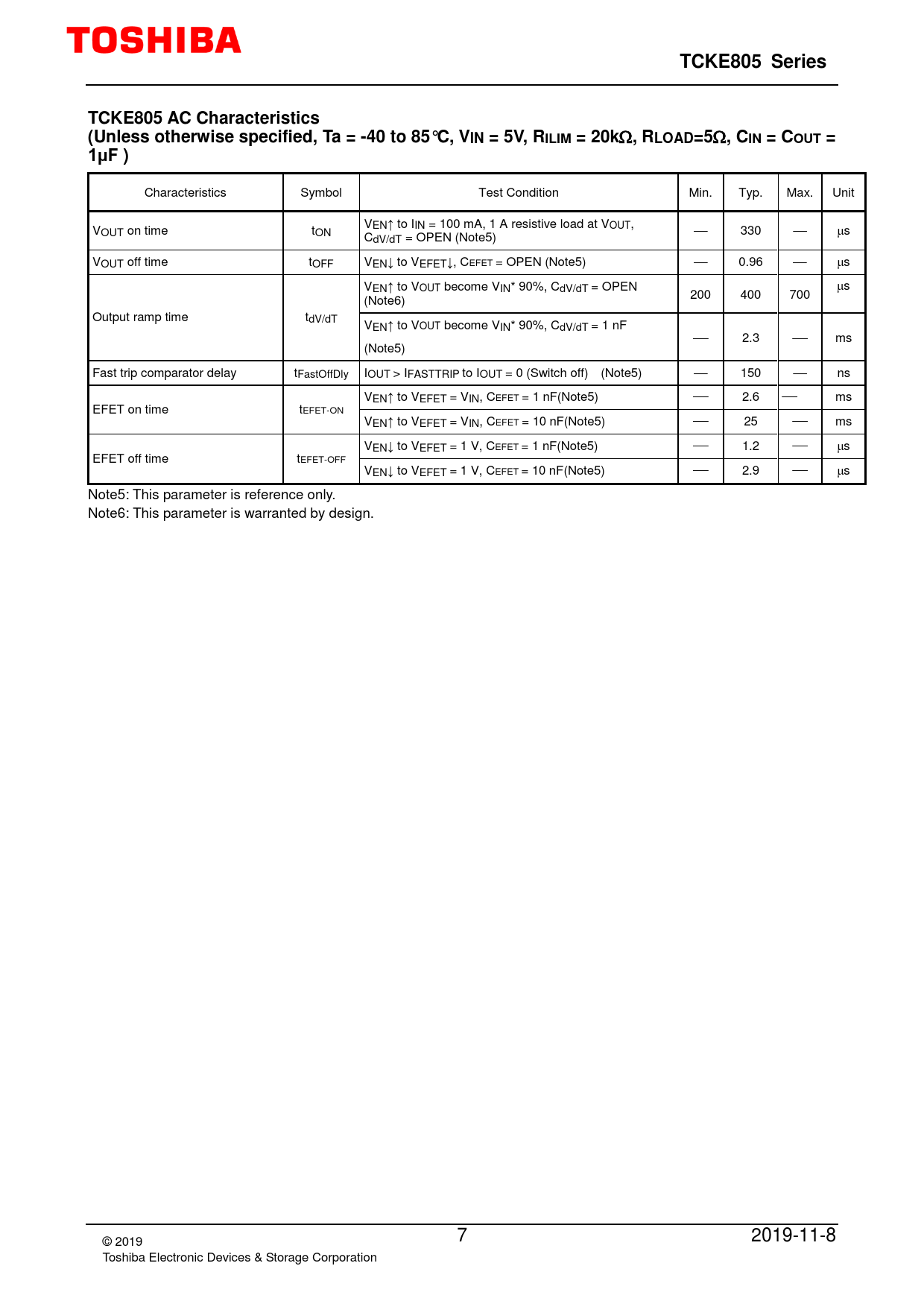 TCKE805 Series. TCKE805 AC Characteristics (Unless otherwise specified, Ta = -40 to 85°C, VIN = 5V, RILIM = 20k. , RLOAD=5