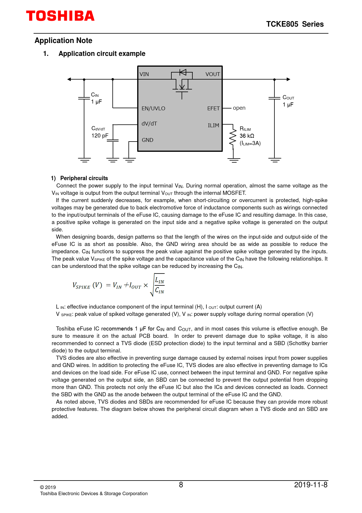 Connect the power supply to the input terminal VIN. During normal operation, almost the same voltage as the VIN voltage is output from the output terminal VOUT through the internal MOSFET. If the current suddenly decreases, for example, when short-circuiting or overcurrent is protected, high-spike voltages may be generated due to back electromotive force of inductance components such as wirings connected to the input/output terminals of the eFuse IC, causing damage to the eFuse IC and resulting damage. In this case, a positive spike voltage is generated on the input side and a negative spike voltage is generated on the output side. When designing boards, design patterns so that the length of the wires on the input-side and output-side of the eFuse IC is as short as possible. Also, the GND wiring area should be as wide as possible to reduce the impedance. CIN functions to suppress the peak value against the positive spike voltage generated by the inputs. The peak value VSPIKE of the spike voltage and the capacitance value of the CIN have the following relationships. It can be understood that the spike voltage can be reduced by increasing the CIN. L IN: effective inductance component of the input terminal (H), I OUT: output current (A) V SPIKE: peak value of spiked voltage generated (V), V IN: power supply voltage during normal operation (V) Toshiba eFuse IC recommends 1 μF for CIN and COUT, and in most cases this volume is effective enough. Be sure to measure it on the actual PCB board. In order to prevent damage due to spike voltage, it is also recommended to connect a TVS diode (ESD protection diode) to the input terminal and a SBD (Schottky barrier diode) to the output terminal. TVS diodes are also effective in preventing surge damage caused by external noises input from power supplies and GND wires. In addition to protecting the eFuse IC, TVS diodes are also effective in preventing damage to ICs and devices on the load side. For eFuse IC use, connect between the input terminal and GND. For negative spike voltage generated on the output side, an SBD can be connected to prevent the output potential from dropping more than GND. This protects not only the eFuse IC but also the ICs and devices connected as loads. Connect the SBD with the GND as the anode between the output terminal of the eFuse IC and the GND. As noted above, TVS diodes and SBDs are recommended for eFuse IC because they can provide more robust protective features. The diagram below shows the peripheral circuit diagram when a TVS diode and an SBD are added. 8 2019-11-8 © 2019 Toshiba Electronic Devices & Storage Corporation