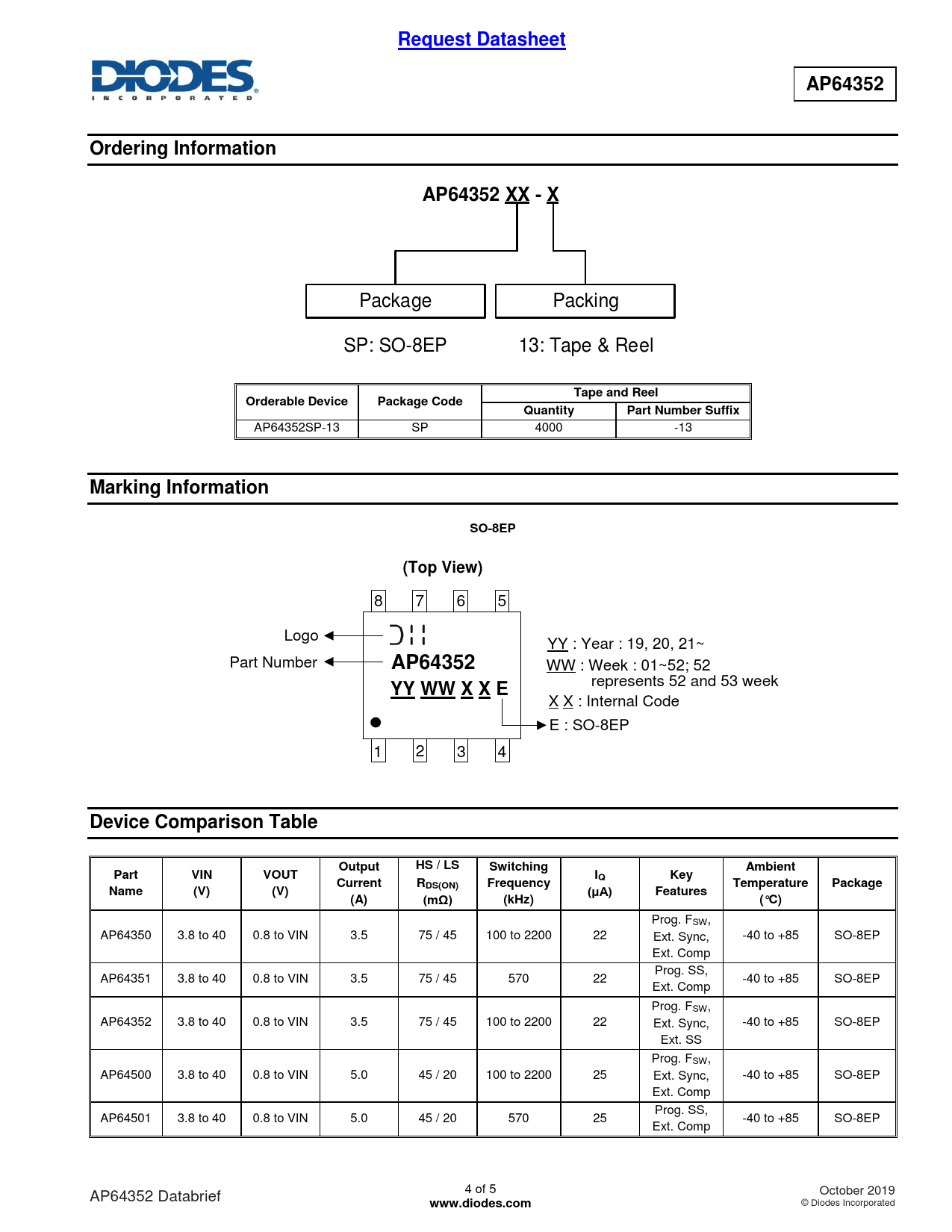 | Páginas / Página | 5 / 4 — Request Datasheet. AP64352. Ordering Information. AP64352 XX - X. Tape … |