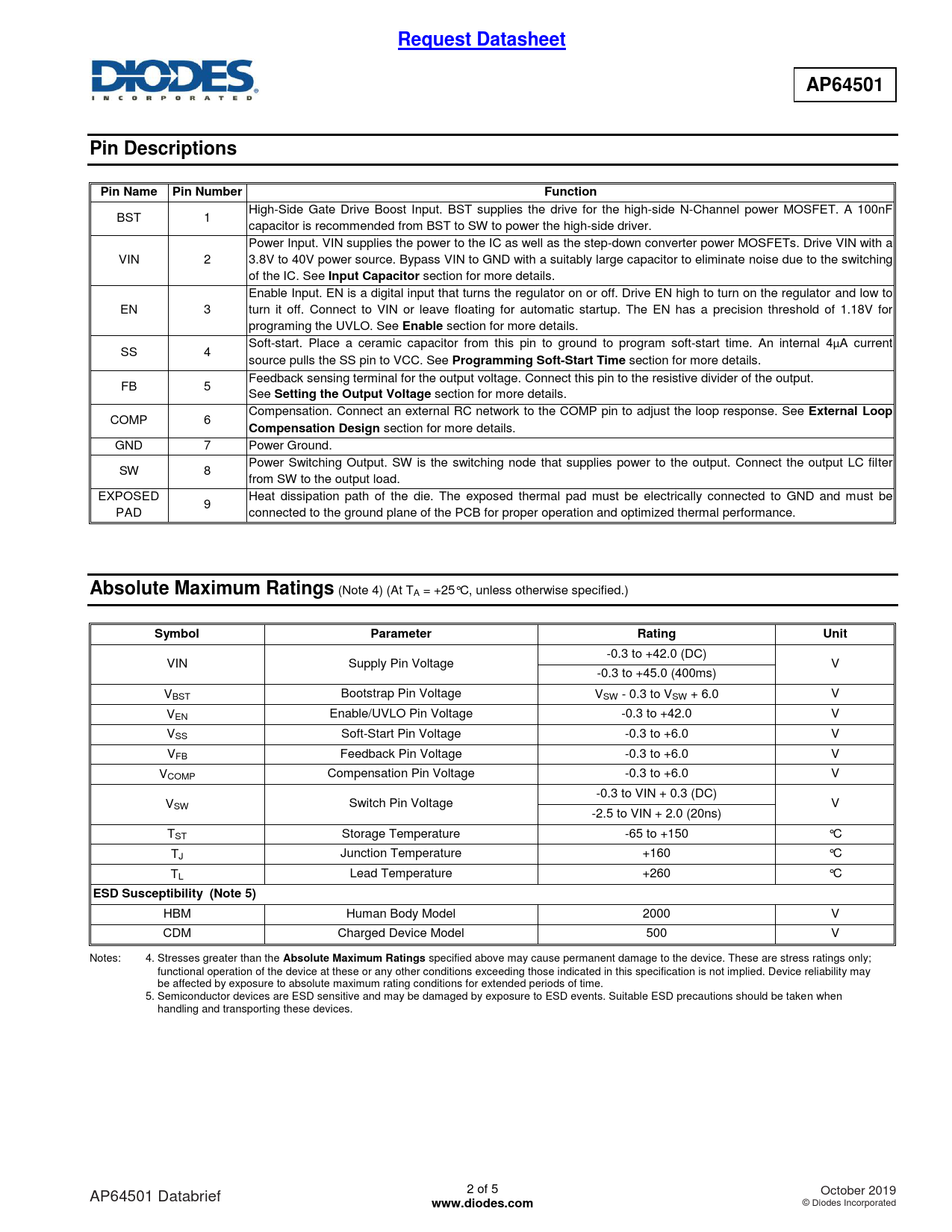 specified above may cause permanent damage to the device. These are stress ratings only; functional operation of the device at these or any other conditions exceeding those indicated in this specification is not implied. Device reliability may be affected by exposure to absolute maximum rating conditions for extended periods of time. 5. Semiconductor devices are ESD sensitive and may be damaged by exposure to ESD events. Suitable ESD precautions should be taken when handling and transporting these devices. 2 of 5 AP64501 Databrief October 2019