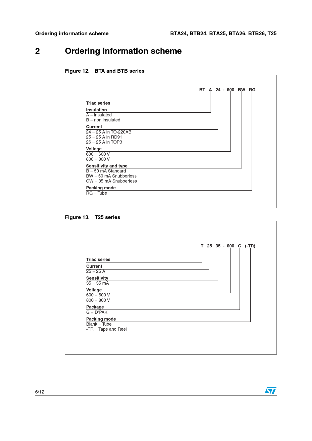 Ordering information scheme BTA24, BTB24, BTA25, BTA26, BTB26, T25 2 Ordering information scheme Figure 12. BTA and BTB series BT A 24 - 600 BW RG Triac series Insulation