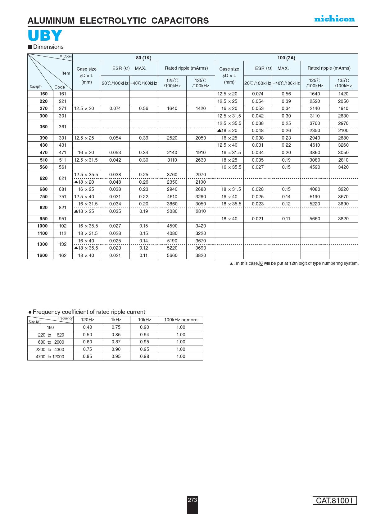 162 18 × 40 0.021 0.11 5660 3820 : In this case, 6 will be put at 12th digit of type numbering system. Frequency coefficient of rated ripple current Frequency 120Hz 1kHz 10kHz 100kHz or more Cap. (µF) 160 0.40 0.75 0.90 1.00 220 to 620 0.50 0.85 0.94 1.00 680 to 2000 0.60 0.87 0.95 1.00 2200 to 4300 0.75 0.90 0.95 1.00 4700 to 12000 0.85 0.95 0.98 1.00 273