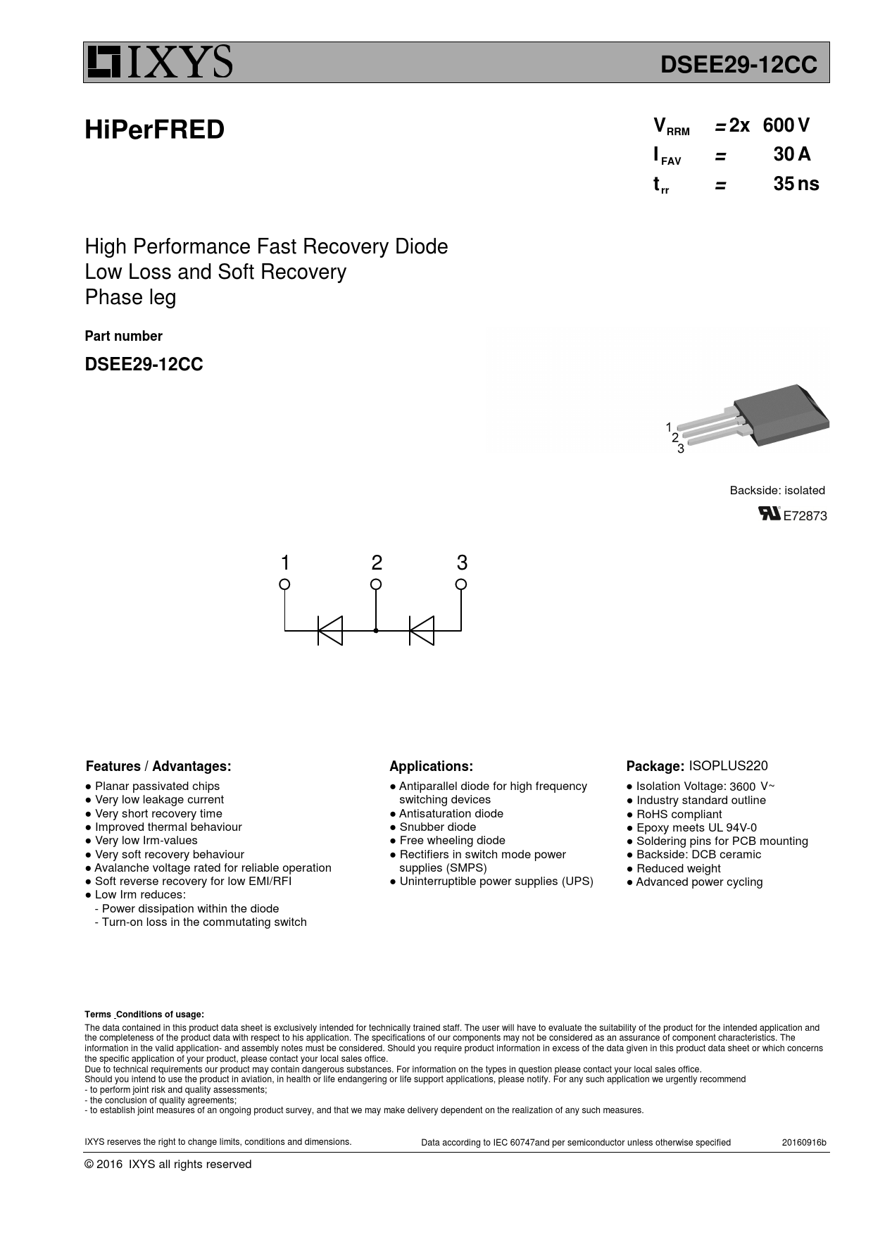 ISOPLUS220 ● Planar passivated chips ● Antiparallel diode for high frequency ● Isolation Voltage: 3 6 0 0 V~ ● Very low leakage current switching devices ● Industry standard outline ● Very short recovery time ● Antisaturation diode ● RoHS compliant ● Improved thermal behaviour ● Snubber diode ● Epoxy meets UL 94V-0 ● Very low Irm-values ● Free wheeling diode ● Soldering pins for PCB mounting ● Very soft recovery behaviour ● Rectifiers in switch mode power ● Backside: DCB ceramic ● Avalanche voltage rated for reliable operation supplies (SMPS) ● Reduced weight ● Soft reverse recovery for low EMI/RFI ● Uninterruptible power supplies (UPS) ● Advanced power cycling ● Low Irm reduces: - Power dissipation within the diode - Turn-on loss in the commutating switch