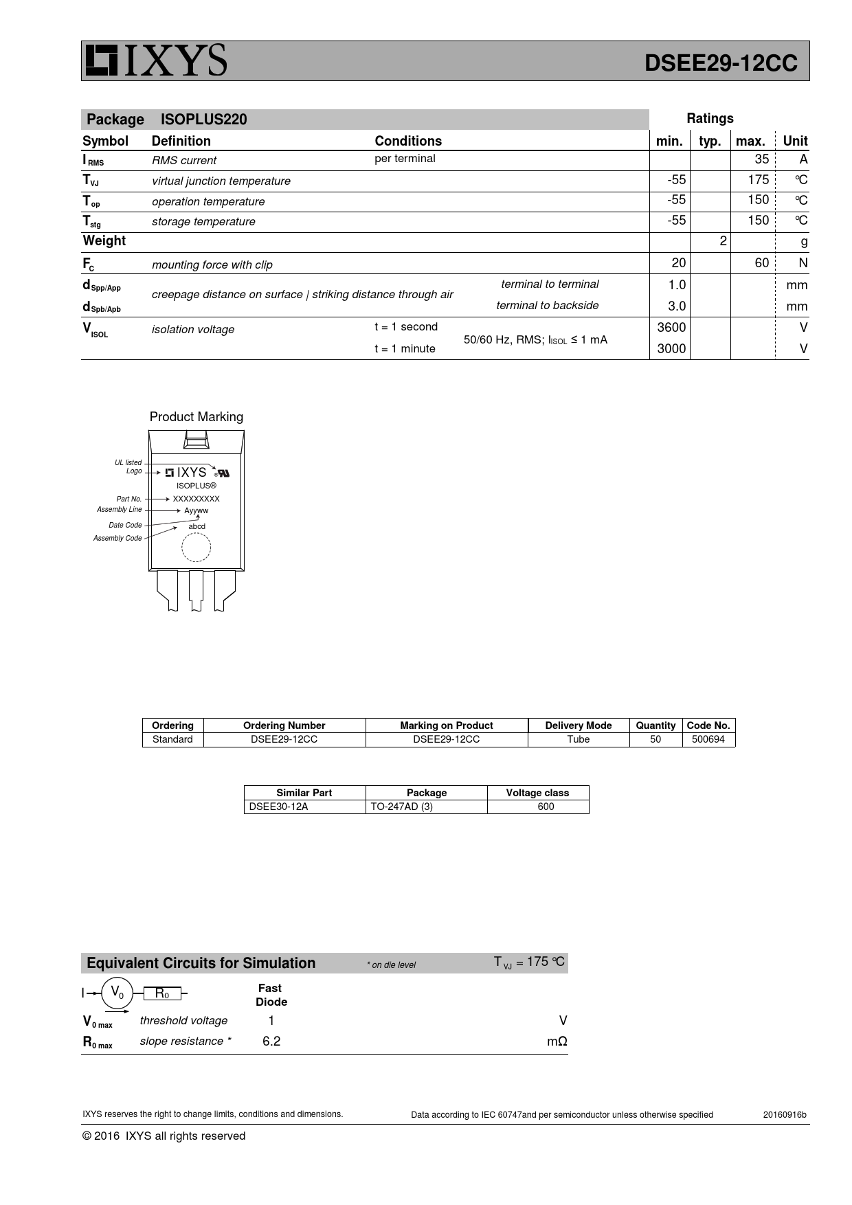 DSEE29-12CC. Package. ISOPLUS220. Ratings. Symbol. Definition. Conditions. min. typ. max. Unit. RMS. stg. Weight. Spp/App. Spb/Apb. ISOL. Ordering