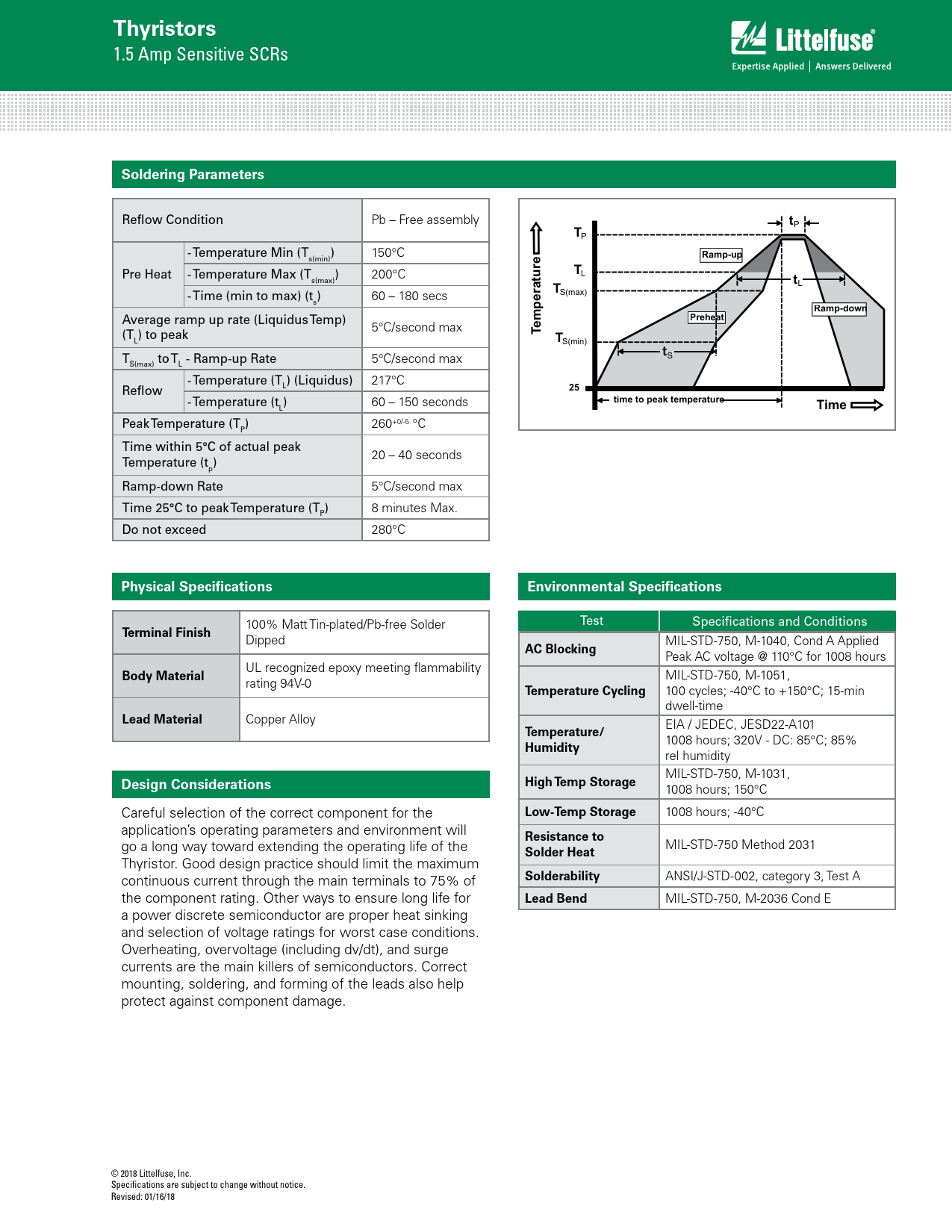 MIL-STD-750, M-2036 Cond E a power discrete semiconductor are proper heat sinking and selection of voltage ratings for worst case conditions. Overheating, overvoltage (including dv/dt), and surge currents are the main killers of semiconductors. Correct mounting, soldering, and forming of the leads also help protect against component damage. © 2018 Littelfuse, Inc. Specifications are subject to change without notice. Revised: 01/16/18