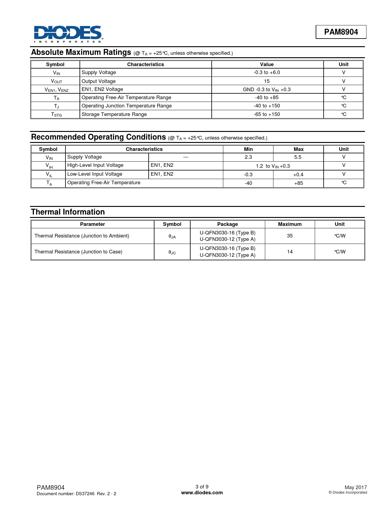 U-QFN3030-16 (Type B) Thermal Resistance (Junction to Ambient) JA 35 °C/W U-QFN3030-12 (Type A) U-QFN3030-16 (Type B) Thermal Resistance (Junction to Case) JC 14 °C/W U-QFN3030-12 (Type A) PAM8904 3 of 9 May 2017 Document number: DS37246 Rev. 2 - 2
