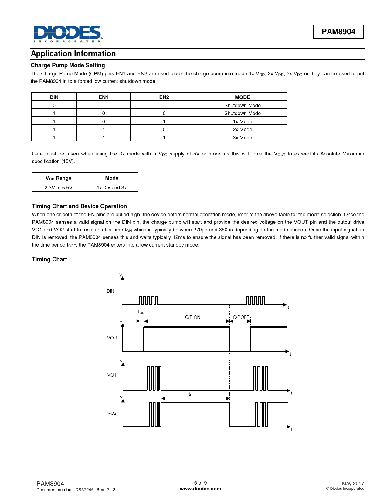 PAM8904. Application Information. Charge Pump Mode Setting. DIN. EN1. EN2. MODE. VDD Range. Mode. Timing Chart and Device Operation