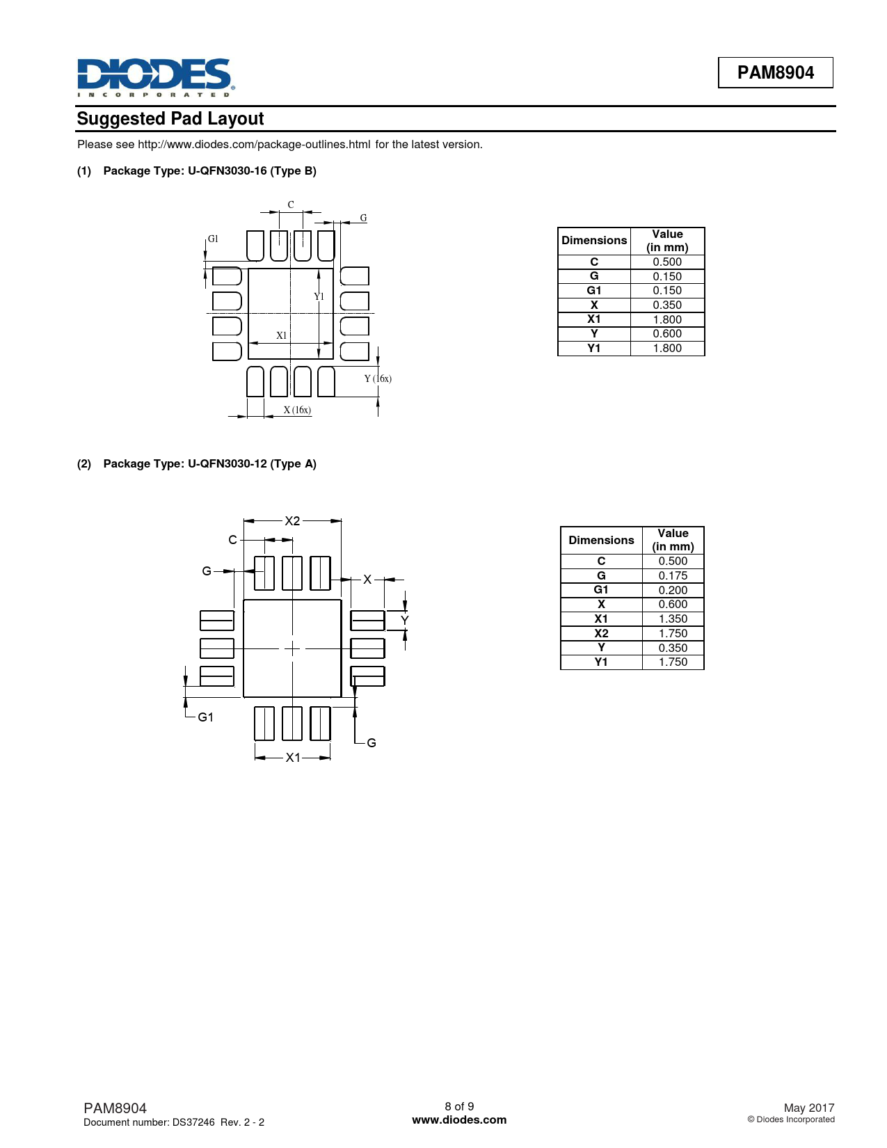 PAM8904. Suggested Pad Layout. (1) Package Type: U-QFN3030-16 (Type B). Value. Dimensions. (in mm)
