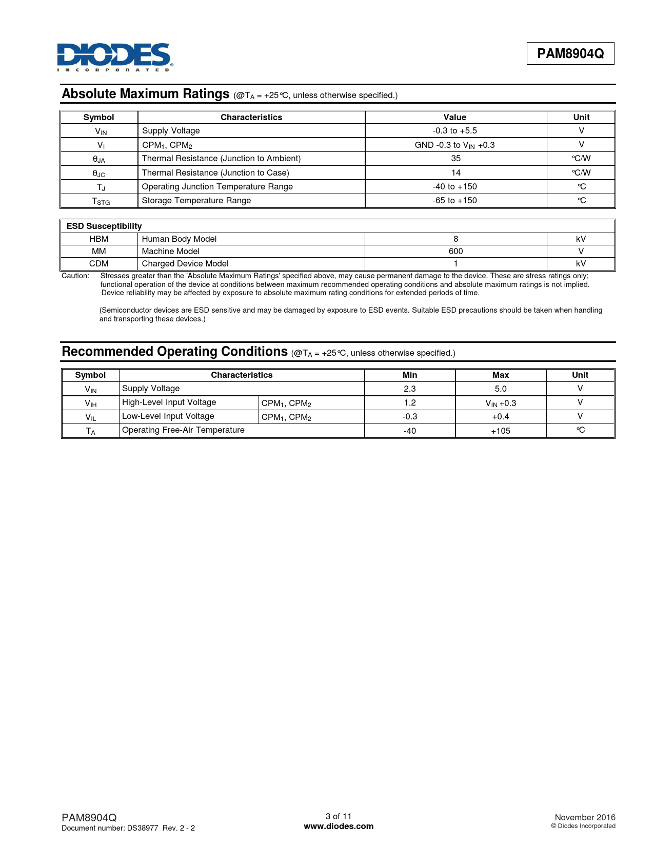 PAM8904Q. Absolute Maximum Ratings. Symbol. Characteristics. Value. Unit. ESD Susceptibility. Recommended Operating Conditions. Min. Max