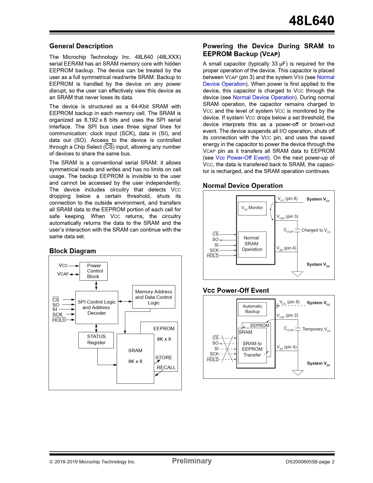 DS20006055B-page 2 Document Outline Serial SRAM Features Hidden EEPROM Backup Features Other Features of the 48L640 Packages Package Types (not to scale) Pin Function Table General Description Block Diagram Normal Device Operation Vcc Power-Off Event 1.0 Electrical Characteristics Absolute Maximum Ratings† TABLE 1-1: DC Characteristics TABLE 1-2: AC Characteristics TABLE 1-3: AC Test Conditions 2.0 Pin Descriptions TABLE 2-1: Pin Function Table 2.1 Chip Select (CS) 2.2 Serial Output (SO) 2.3 Serial Input (SI) 2.4 Serial Clock (SCK) 2.5 Hold (HOLD) 3.0 Memory Organization 3.1 Data Array Organization 3.2 16-Bit Nonvolatile User Space 3.3 Device Registers 3.3.1 STATUS Register 4.0 Functional Description FIGURE 4-1: SPI Mode 0 and Mode 3 4.1 Interfacing the 48L640 on the SPI Bus 4.1.1 Selecting the Device 4.1.2 Sending Data to the Device 4.1.3 Receiving Data from the Device 4.2 Device Opcodes 4.2.1 Serial Opcode 4.2.2 Hold Function FIGURE 4-2: Hold Mode 5.0 Write Enable and Disable 5.1 Write Enable Instruction (WREN) FIGURE 5-1: WREN Waveform 5.2 Write Disable Instruction (WRDI) FIGURE 5-2: WRDI Waveform 6.0 STATUS Register 6.1 Block Write-Protect Bits TABLE 6-2: Block Write-Protect Bits 6.2 Write Enable Latch 6.3 Ready/Busy Status Latch 6.4 Read STATUS Register (RDSR) FIGURE 6-1: RDSR Waveform 6.5 Write STATUS Register (WRSR) FIGURE 6-2: WRSR Waveform 7.0 Read Operations 7.1 Reading from the SRAM (READ) FIGURE 7-1: Read SRAM (READ) Waveform 7.2 Read Last Successfully Written Address (RDLSWA) FIGURE 7-2: Read Last Successfully Written Address Waveform 8.0 Write Commands 8.1 Write Instruction Sequences 8.1.1 SRAM Byte Write FIGURE 8-1: SRAM Byte Write Waveform 8.1.2 Continuous Write FIGURE 8-2: Continuous SRAM Write Waveform 9.0 Nonvolatile User Space Access 9.1 Write Nonvolatile User Space (WRNUR) 9.2 Read Nonvolatile User Space (RDNUR) 10.0 Secure Operations 10.1 Secure Write 10.2 Secure Read TABLE 10-1: Secure Write Bits 11.0 Store/Recall Operations 11.1 Automatic Store on Any Power Disruption 11.2 Automatic Recall to SRAM 11.3 Software Store Command FIGURE 11-1: Software Store 11.4 Software Recall Command FIGURE 11-2: Software Recall 11.5 Polling Routine FIGURE 11-3: Polling Flow 12.0 Hibernation FIGURE 12-1: Hibernate Waveform 13.0 Trip Voltage 13.1 Power Switchover 14.0 Packaging Information 14.1 Package Marking Information Product ID System Trademarks Worldwide Sales and Service