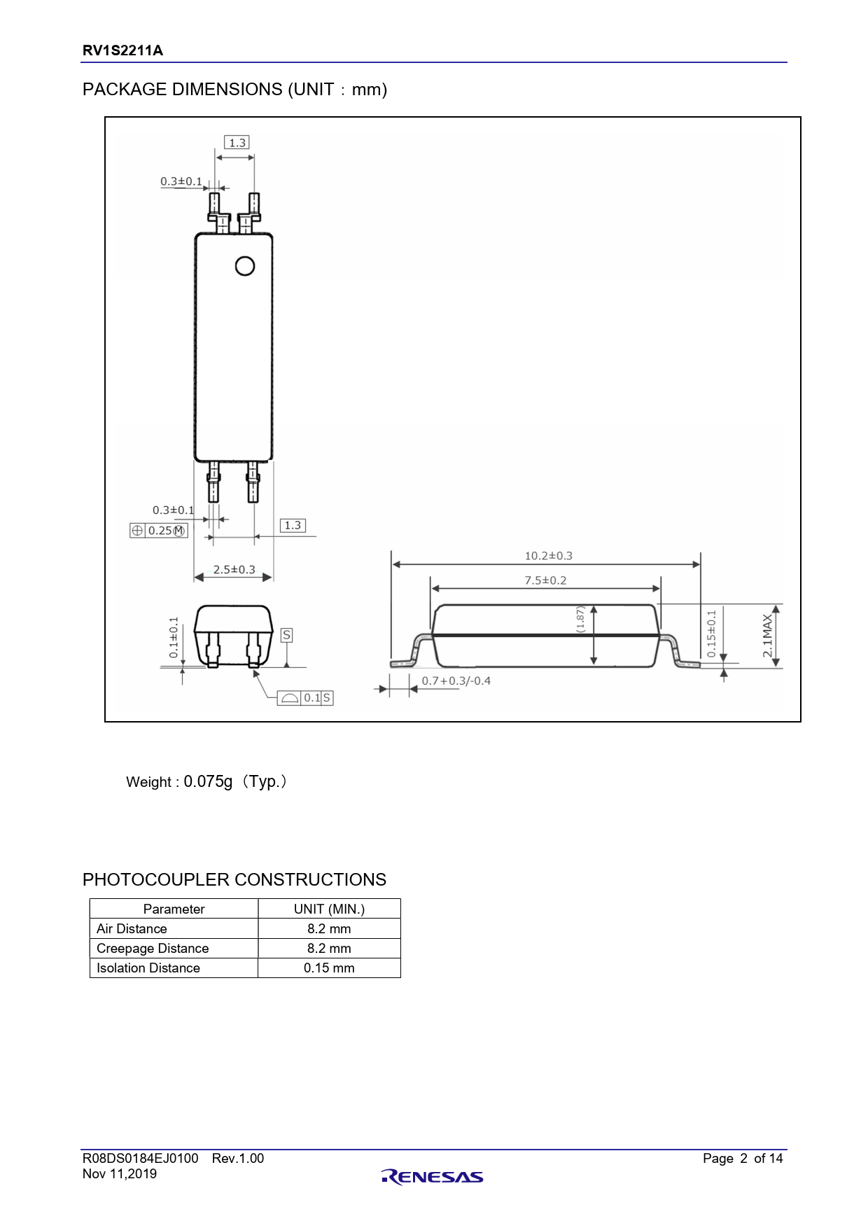 RV1S2211A 章題 PACKAGE DIMENSIONS (UNIT:mm) Weight : 0.075g(Typ.) PHOTOCOUPLER CONSTRUCTIONS Parameter UNIT (MIN.) Air Distance 8.2 mm Creepage Distance 8.2 mm Isolation Distance 0.15 mm R08DS0184EJ0100 Rev.1.00 Page 2 of 14 Nov 11,2019