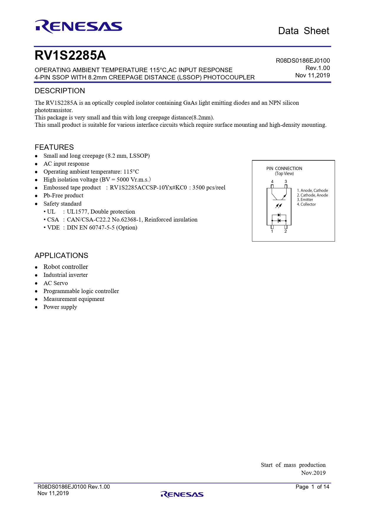 Data Sheet RV1S2285A R08DS0186EJ0100 OPERATING AMBIENT TEMPERATURE 115°C,AC INPUT RESPONSE Rev.1.00 4-PIN SSOP WITH 8.2mm CREEPAGE DISTANCE (LSSOP) PHOTOCOUPLER Nov 11,2019 DESCRIPTION The RV1S2285A is an optically coupled isolator containing GaAs light emitting diodes and an NPN silicon phototransistor. This package is very small and thin with long creepage distance(8.2mm). This small product is suitable for various interface circuits which require surface mounting and high-density mounting. FEATURES Small and long creepage (8.2 mm, LSSOP) AC input response Operating ambient temperature: 115°C PIN CONNECTION (Top View) High isolation voltage (BV = 5000 Vr.m.s.) 4 3 Embossed tape product :RV1S2285ACCSP-10Yx#KC0 : 3500 pcs/reel 1. Anode, Cathode Pb-Free product 2. Cathode, Anode 3. Emitter Safety standard 4. Collector • UL :UL1577, Double protection • CSA :CAN/CSA-C22.2 No.62368-1, Reinforced insulation • VDE :DIN EN 60747-5-5 (Option) 1 2 APPLICATIONS Robot controller Industrial inverter AC Servo Programmable logic controller Measurement equipment Power supply Start of mass production Nov.2019 R08DS0186EJ0100 Rev.1.00 Page 1 of 14 Nov 11,2019