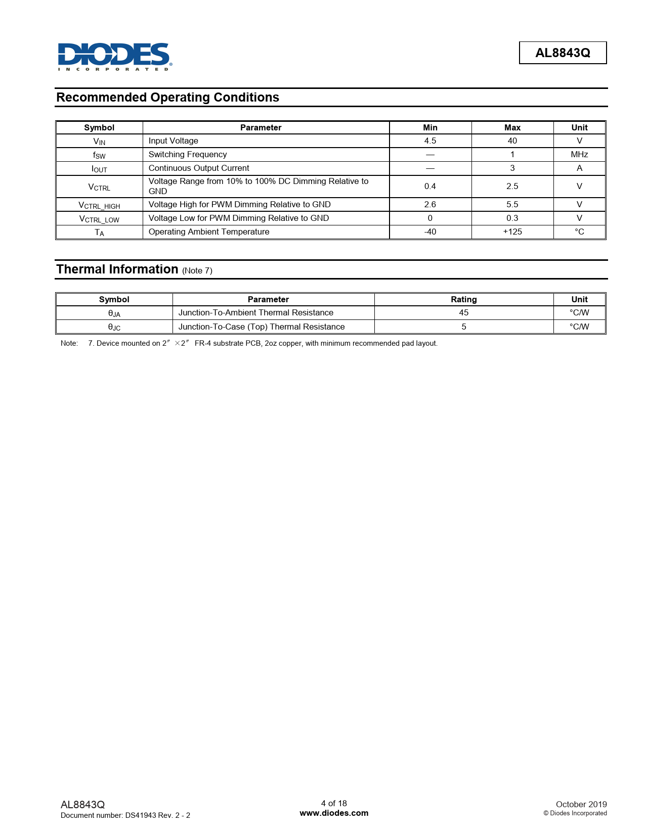 AL8843Q. Recommended Operating Conditions. Symbol. Parameter. Min. Max. Unit. Thermal Information. Rating. www.diodes.com