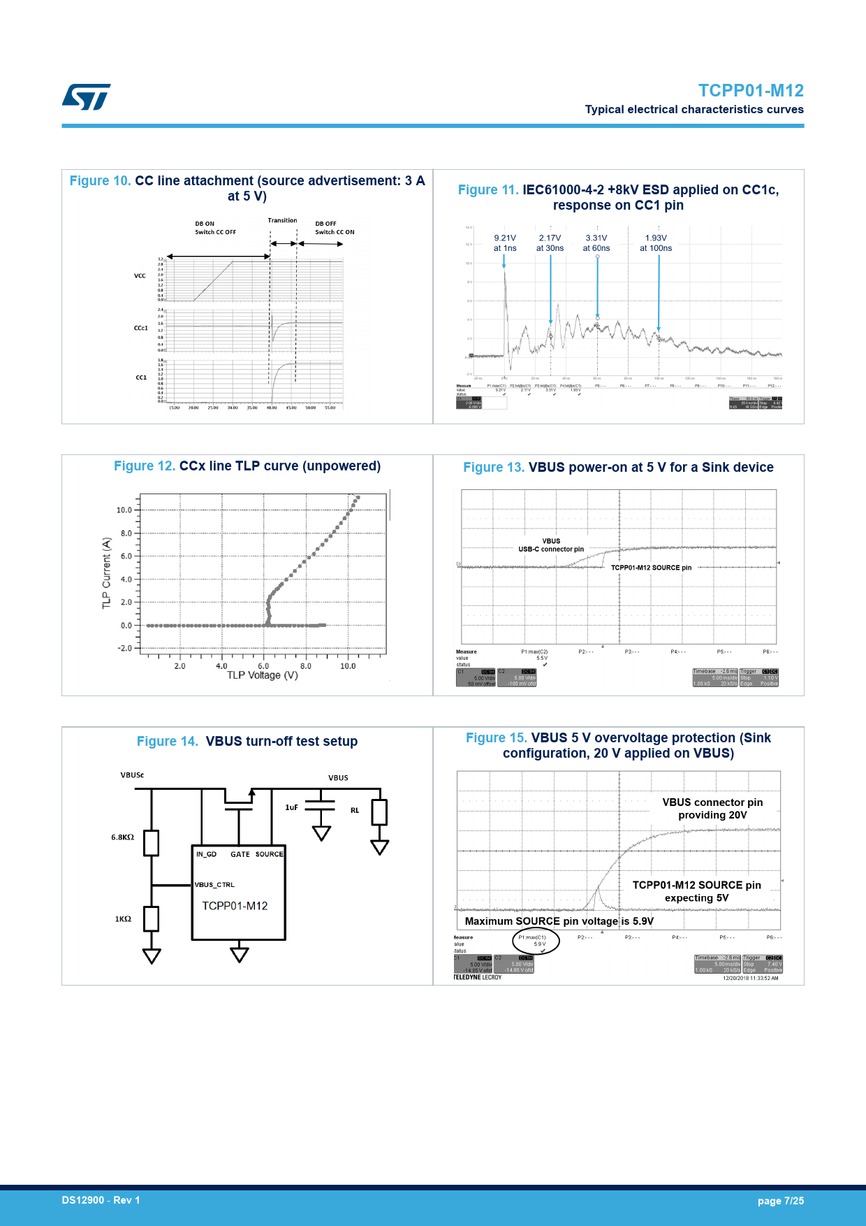 TCPP01-M12 Typical electrical characteristics curves Figure 10. CC line attachment (source advertisement: 3 A at 5 V) Figure 11. IEC61000-4-2 +8kV ESD applied on CC1c, response on CC1 pin Figure 12. CCx line TLP curve (unpowered) Figure 13. VBUS power-on at 5 V for a Sink device Figure 14. VBUS turn-off test setup Figure 15. VBUS 5 V overvoltage protection (Sink configuration, 20 V applied on VBUS) DS12900