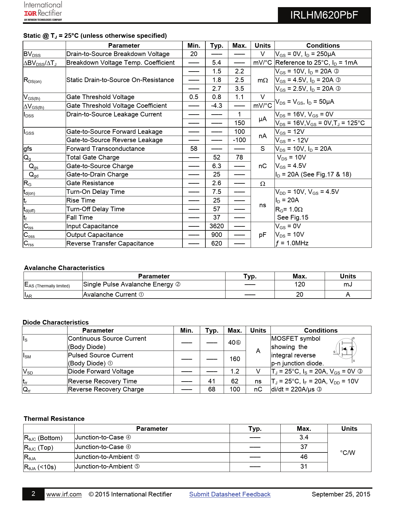 RJC (Bottom) Junction-to-Case ––– 3.4 RJC (Top) Junction-to-Case ––– 37 °C/W RJA Junction-to-Ambient ––– 46 RJA (<10s) Junction-to-Ambient ––– 31 2 www.irf.com © 2015 International Rectifier Submit Datasheet Feedback September 25, 2015