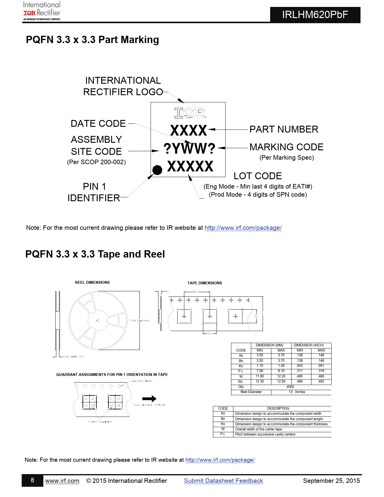 IRLHM620PbF PQFN 3.3 x 3.3 Part Marking INTERNATIONAL RECTIFIER LOGO DATE CODE XXXX PART NUMBER ASSEMBLY SITE CODE ?YWW? MARKING CODE (Per Marking Spec) (Per SCOP 200-002) XXXXX LOT CODE PIN 1 (Eng Mode - Min last 4 digits of EATI#) (Prod Mode - 4 digits of SPN code) IDENTIFIER Note: For the most current drawing please refer to IR website at http://www.irf.com/package/ PQFN 3.3 x 3.3 Tape and Reel