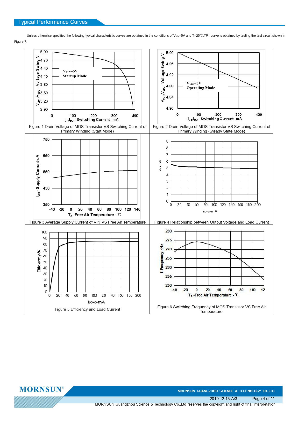 Typical Performance Curves Unless otherwise specified,the fol owing typical characteristic curves are obtained in the conditions of VVIN=5V and T=25℃.TP1 curve is obtained by testing the test circuit shown in Figure 7. VVIN=5VStartup ModeVVIN=5VOperating Mode Figure 1 Drain Voltage of MOS Transistor VS.Switching Current of Figure 2 Drain Voltage of MOS Transistor VS.Switching Current of Primary Winding (Start Mode) Primary Winding (Steady State Mode) Figure 3 Average Supply Current of VIN VS Free Air Temperature Figure 4 Relationship between Output Voltage and Load Current Figure 5 Efficiency and Load Current Figure 6 Switching Frequency of MOS Transistor VS Free Air Temperature 2019.12.13-A/3 Page 4 of 11 MORNSUN Guangzhou Science & Technology Co.,Ltd.reserves the copyright and right of final interpretation Document Outline Mornsun Guangzhou Science & Technology Co.,Ltd.