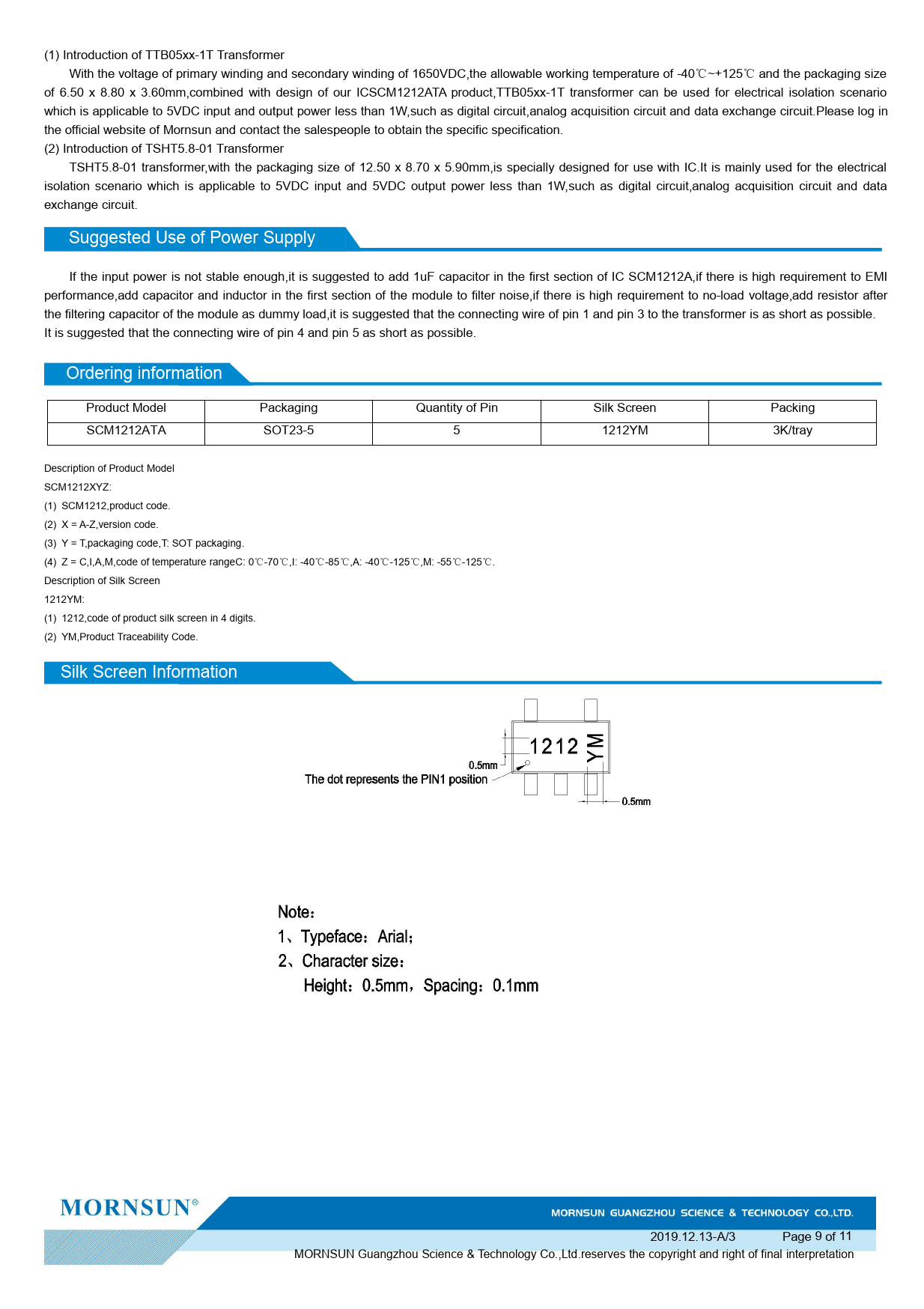 (1) Introduction of TTB05xx-1T Transformer With the voltage of primary winding and secondary winding of 1650VDC,the al owable working temperature of -40℃~+125℃ and the packaging size of 6.50 x 8.80 x 3.60mm,combined with design of our ICSCM1212ATA product,TTB05xx-1T transformer can be used for electrical isolation scenario which is applicable to 5VDC input and output power less than 1W,such as digital circuit,analog acquisition circuit and data exchange circuit.Please log in the official website of Mornsun and contact the salespeople to obtain the specific specification. (2) Introduction of TSHT5.8-01 Transformer TSHT5.8-01 transformer,with the packaging size of 12.50 x 8.70 x 5.90mm,is special y designed for use with IC.It is mainly used for the electrical isolation scenario which is applicable to 5VDC input and 5VDC output power less than 1W,such as digital circuit,analog acquisition circuit and data exchange circuit. Suggested Use of Power Supply If the input power is not stable enough,it is suggested to add 1uF capacitor in the first section of IC SCM1212A,if there is high requirement to EMI performance,add capacitor and inductor in the first section of the module to filter noise,if there is high requirement to no-load voltage,add resistor after the filtering capacitor of the module as dummy load,it is suggested that the connecting wire of pin 1 and pin 3 to the transformer is as short as possible. It is suggested that the connecting wire of pin 4 and pin 5 as short as possible. Ordering information Product Model Packaging Quantity of Pin Silk Screen Packing SCM1212ATA SOT23-5 5 1212YM 3K/tray Description of Product Model SCM1212XYZ: (1) SCM1212,product code. (2) X = A-Z,version code. (3) Y = T,packaging code,T: SOT packaging. (4) Z = C,I,A,M,code of temperature rangeC: 0℃-70℃,I: -40℃-85℃,A: -40℃-125℃,M: -55℃-125℃. Description of Silk Screen 1212YM: (1) 1212,code of product silk screen in 4 digits. (2) YM,Product Traceability Code. Silk Screen Information (S0T23-6) 2019.12.13-A/3 Page 9 of 11 MORNSUN Guangzhou Science & Technology Co.,Ltd.reserves the copyright and right of final interpretation Document Outline Mornsun Guangzhou Science & Technology Co.,Ltd.