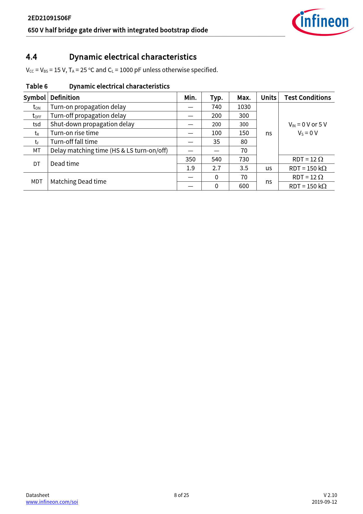 2ED21091S06F 650 V half bridge gate driver with integrated bootstrap diode 4.4 Dynamic electrical characteristics VCC = VBS = 15 V, TA = 25 oC and CL = 1000 pF unless otherwise specified. Table 6 Dynamic electrical characteristics Symbol Definition Min. Typ. Max. Units Test Conditions tON Turn-on propagation delay — 740 1030 tOFF Turn-off propagation delay — 200 300 tsd Shut-down propagation delay — 200 300 VIN = 0 V or 5 V tR Turn-on rise time — 100 150 ns VS = 0 V tF Turn-off fal time — 35 80 MT Delay matching time (HS & LS turn-on/off) — — 70 350 540 730 RDT = 12 Ω DT Dead time 1.9 2.7 3.5 us RDT = 150 kΩ — 0 70 RDT = 12 Ω MDT Matching Dead time ns — 0 600 RDT = 150 kΩ Datasheet 8 of 25 V 2.10 www.infineon.com/soi 2019-09-12 Document Outline Features Product summary Potential applications Product validation Ordering information Description 1 Table of contents 2 Block diagram 3 Pin configuration and functionality 3.1 Pin configuration 3.2 Pin functionality 4 Electrical parameters 4.1 Absolute maximum ratings 4.2 Recommended operating conditions 4.3 Static electrical characteristics 4.4 Dynamic electrical characteristics 5 Application information and additional details 5.1 IGBT / MOSFET gate drive 5.2 Switching and timing relationships 5.3 Deadtime 5.4 Matched propagation delays 5.5 Shutdown input 5.6 Input logic compatibility 5.7 Undervoltage lockout 5.8 Bootstrap diode 5.9 Calculating the bootstrap capacitance CBS 5.10 Tolerant to negative tranisents on input pins 5.11 Negative voltage transient tolerance of VS pin 5.12 NTSOA – Negative Transient Safe Operating Area 5.13 Higher headroom for input to output signal transmission with logic operation upto -11 V 5.14 Maximum switching frequency 5.15 PCB layout tips 6 Qualification information0F 7 Related products 8 Package details 9 Part marking information 10 Additional documentation and resources 10.1 Infineon online forum resources 11 Revision history