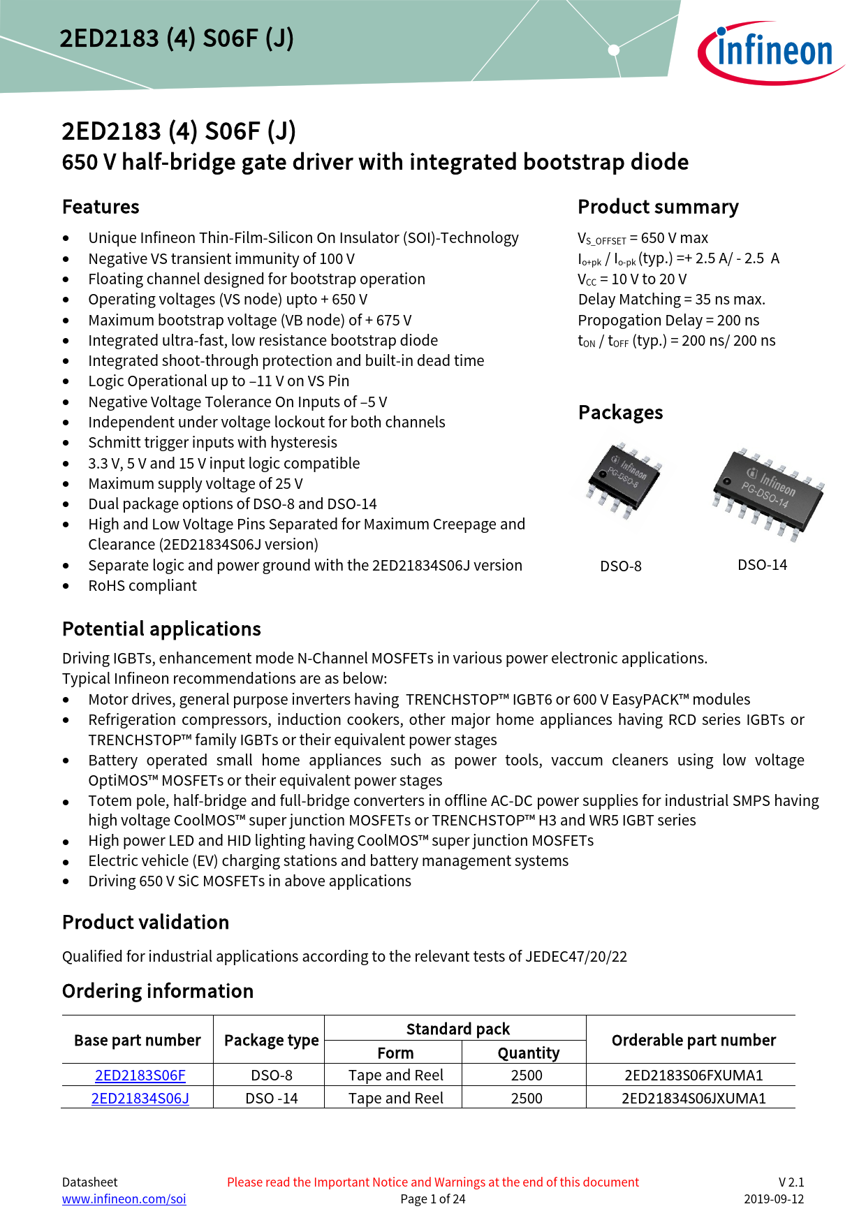 link to page 24 2ED2183 (4) S06F (J) 2ED2183 (4) S06F (J) 650 V half-bridge gate driver with integrated bootstrap diode Features Product summary • Unique Infineon Thin-Film-Silicon On Insulator (SOI)-Technology VS_OFFSET = 650 V max • Negative VS transient immunity of 100 V Io+pk / Io-pk (typ.) =+ 2.5 A/ - 2.5 A • Floating channel designed for bootstrap operation VCC = 10 V to 20 V • Operating voltages (VS node) upto + 650 V Delay Matching = 35 ns max. • Maximum bootstrap voltage (VB node) of + 675 V Propogation Delay = 200 ns • Integrated ultra-fast, low resistance bootstrap diode tON / tOFF (typ.) = 200 ns/ 200 ns • Integrated shoot-through protection and built-in dead time • Logic Operational up to –11 V on VS Pin • Negative Voltage Tolerance On Inputs of –5 V • Independent under voltage lockout for both channels Packages • Schmitt trigger inputs with hysteresis • 3.3 V, 5 V and 15 V input logic compatible • Maximum supply voltage of 25 V • Dual package options of DSO-8 and DSO-14 • High and Low Voltage Pins Separated for Maximum Creepage and Clearance (2ED21834S06J version) • Separate logic and power ground with the 2ED21834S06J version DSO-8 DSO-14 • RoHS compliant Potential applications Driving IGBTs, enhancement mode N-Channel MOSFETs in various power electronic applications. Typical Infineon recommendations are as below: • Motor drives, general purpose inverters having TRENCHSTOP™ IGBT6 or 600 V EasyPACK™ modules • Refrigeration compressors, induction cookers, other major home appliances having RCD series IGBTs or TRENCHSTOP™ family IGBTs or their equivalent power stages • Battery operated small home appliances such as power tools, vaccum cleaners using low voltage OptiMOS™ MOSFETs or their equivalent power stages • Totem pole, half-bridge and full-bridge converters in offline AC-DC power supplies for industrial SMPS having high voltage CoolMOS™ super junction MOSFETs or TRENCHSTOP™ H3 and WR5 IGBT series • High power LED and HID lighting having CoolMOS™ super junction MOSFETs • Electric vehicle (EV) charging stations and battery management systems • Driving 650 V SiC MOSFETs in above applications Product validation Qualified for industrial applications according to the relevant tests of JEDEC47/20/22 Ordering information Standard pack Base part number Package type Orderable part number Form Quantity 2ED2183S06F DSO-8 Tape and Reel 2500 2ED2183S06FXUMA1 2ED21834S06J DSO -14 Tape and Reel 2500 2ED21834S06JXUMA1 Datasheet Please read the Important Notice and Warnings at the end of this document V 2.1 www.infineon.com/soi Page 1 of 24 2019-09-12 Document Outline Features Product summary Product validation Description 1 Table of contents 2 Block diagram 3 Pin configuration and functionality 3.1 Pin configuration 3.2 Pin functionality 4 Electrical parameters 4.1 Absolute maximum ratings 4.2 Recommended operating conditions 4.3 Static electrical characteristics 4.4 Dynamic electrical characteristics 5 Application information and additional details 5.1 IGBT / MOSFET gate drive 5.2 Switching and timing relationships 5.3 Deadtime and matched propagation delays 5.4 Input logic compatibility 5.5 Undervoltage lockout 5.6 Bootstrap diode 5.7 Calculating the bootstrap capacitance CBS 5.8 Tolerant to negative tranisents on input pins 5.9 Negative voltage transient tolerance of VS pin 5.10 NTSOA – Negative Transient Safe Operating Area 5.11 Higher headroom for input to output signal transmission with logic operation upto -11 V 5.12 Maximum switching frequency 5.13 PCB layout tips 6 Qualification information0F 7 Related products 8 Package details 9 Part marking information 10 Additional documentation and resources 10.1 Infineon online forum resources 11 Revision history
