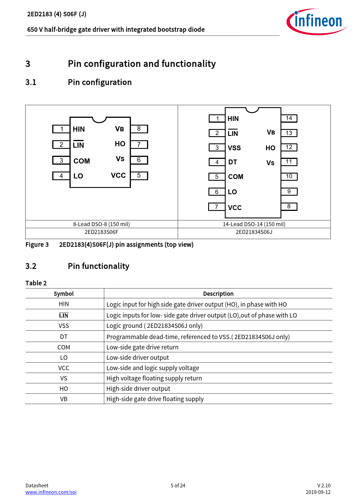 8 8-Lead DSO-8 (150 mil) 14-Lead DSO-14 (150 mil) 2ED2183S06F 2ED21834S06J Figure 3 2ED2183(4)S06F(J) pin assignments (top view) 3.2 Pin functionality Table 2 Symbol Description HIN Logic input for high side gate driver output (HO), in phase with HO 𝐋𝐋𝐋𝐋𝐋𝐋 Logic inputs for low- side gate driver output (LO),out of phase with LO VSS Logic ground ( 2ED21834S06J only) DT Programmable dead-time, referenced to VSS.( 2ED21834S06J only) COM Low-side gate drive return LO Low-side driver output VCC Low-side and logic supply voltage VS High voltage floating supply return HO High-side driver output VB High-side gate drive floating supply Datasheet 5 of 24 V 2.10 www.infineon.com/soi 2019-09-12 Document Outline Features Product summary Product validation Description 1 Table of contents 2 Block diagram 3 Pin configuration and functionality 3.1 Pin configuration 3.2 Pin functionality 4 Electrical parameters 4.1 Absolute maximum ratings 4.2 Recommended operating conditions 4.3 Static electrical characteristics 4.4 Dynamic electrical characteristics 5 Application information and additional details 5.1 IGBT / MOSFET gate drive 5.2 Switching and timing relationships 5.3 Deadtime and matched propagation delays 5.4 Input logic compatibility 5.5 Undervoltage lockout 5.6 Bootstrap diode 5.7 Calculating the bootstrap capacitance CBS 5.8 Tolerant to negative tranisents on input pins 5.9 Negative voltage transient tolerance of VS pin 5.10 NTSOA – Negative Transient Safe Operating Area 5.11 Higher headroom for input to output signal transmission with logic operation upto -11 V 5.12 Maximum switching frequency 5.13 PCB layout tips 6 Qualification information0F 7 Related products 8 Package details 9 Part marking information 10 Additional documentation and resources 10.1 Infineon online forum resources 11 Revision history