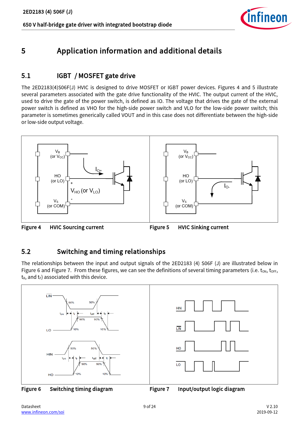 2ED2183 (4) S06F (J) 650 V half-bridge gate driver with integrated bootstrap diode 5 Application information and additional details 5.1 IGBT / MOSFET gate drive The 2ED2183(4)S06F(J) HVIC is designed to drive MOSFET or IGBT power devices. Figures 4 and 5 illustrate several parameters associated with the gate drive functionality of the HVIC. The output current of the HVIC, used to drive the gate of the power switch, is defined as IO. The voltage that drives the gate of the external power switch is defined as VHO for the high-side power switch and VLO for the low-side power switch; this parameter is sometimes generical y cal ed VOUT and in this case does not differentiate between the high-side or low-side output voltage. VB VB (or VCC) (or VCC) IO+ HO HO (or LO) + (or LO) I V O- HO (or VLO) V - S VS (or COM) (or COM) Figure 4 HVIC Sourcing current Figure 5 HVIC Sinking current 5.2 Switching and timing relationships The relationships between the input and output signals of the 2ED2183 (4) S06F (J) are il ustrated below in Figure 6 and Figure 7. From these figures, we can see the definitions of several timing parameters (i.e. tON, tOFF, tR, and tF) associated with this device. Figure 6 Switching timing diagram Figure 7 Input/output logic diagram Datasheet 9 of 24 V 2.10 www.infineon.com/soi 2019-09-12 Document Outline Features Product summary Product validation Description 1 Table of contents 2 Block diagram 3 Pin configuration and functionality 3.1 Pin configuration 3.2 Pin functionality 4 Electrical parameters 4.1 Absolute maximum ratings 4.2 Recommended operating conditions 4.3 Static electrical characteristics 4.4 Dynamic electrical characteristics 5 Application information and additional details 5.1 IGBT / MOSFET gate drive 5.2 Switching and timing relationships 5.3 Deadtime and matched propagation delays 5.4 Input logic compatibility 5.5 Undervoltage lockout 5.6 Bootstrap diode 5.7 Calculating the bootstrap capacitance CBS 5.8 Tolerant to negative tranisents on input pins 5.9 Negative voltage transient tolerance of VS pin 5.10 NTSOA – Negative Transient Safe Operating Area 5.11 Higher headroom for input to output signal transmission with logic operation upto -11 V 5.12 Maximum switching frequency 5.13 PCB layout tips 6 Qualification information0F 7 Related products 8 Package details 9 Part marking information 10 Additional documentation and resources 10.1 Infineon online forum resources 11 Revision history