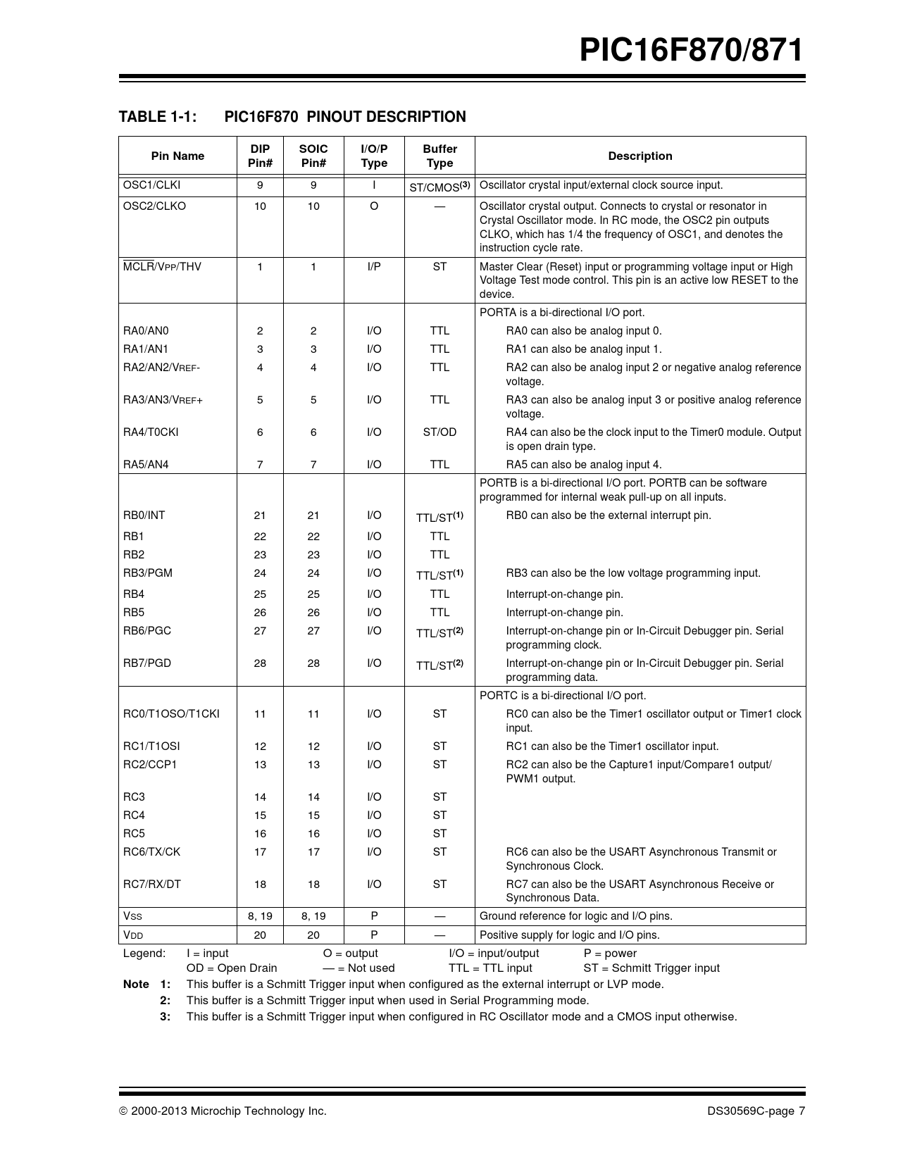 PIC16F870/871TABLE 1-1:PIC16F870 PINOUT DESCRIPTIONDIPSOICI/O/PBufferPin NameDescriptionPin#Pin#TypeType OSC1/CLKI 9 9 I ST/CMOS (3) Oscillator crystal input/external clock source input. OSC2/CLKO 10 10 O — Oscillator crystal output. Connects to crystal or resonator in Crystal Oscillator mode. In RC mode, the OSC2 pin outputs CLKO, which has 1/4 the frequency of OSC1, and denotes the instruction cycle rate. MCLR/VPP/THV 1 1 I/P ST Master Clear (Reset) input or programming voltage input or High Voltage Test mode control. This pin is an active low RESET to the device. PORTA is a bi-directional I/O port. RA0/AN0 2 2 I/O TTL RA0 can also be analog input 0. RA1/AN1 3 3 I/O TTL RA1 can also be analog input 1. RA2/AN2/VREF- 4 4 I/O TTL RA2 can also be analog input 2 or negative analog reference voltage. RA3/AN3/VREF+ 5 5 I/O TTL RA3 can also be analog input 3 or positive analog reference voltage. RA4/T0CKI 6 6 I/O ST/OD RA4 can also be the clock input to the Timer0 module. Output is open drain type. RA5/AN4 7 7 I/O TTL RA5 can also be analog input 4. PORTB is a bi-directional I/O port. PORTB can be software programmed for internal weak pull-up on all inputs. RB0/INT 21 21 I/O TTL/ST (1) RB0 can also be the external interrupt pin. RB1 22 22 I/O TTL RB2 23 23 I/O TTL RB3/PGM 24 24 I/O TTL/ST (1) RB3 can also be the low voltage programming input. RB4 25 25 I/O TTL Interrupt-on-change pin. RB5 26 26 I/O TTL Interrupt-on-change pin. RB6/PGC 27 27 I/O TTL/ST (2) Interrupt-on-change pin or In-Circuit Debugger pin. Serial programming clock. RB7/PGD 28 28 I/O TTL/ST (2) Interrupt-on-change pin or In-Circuit Debugger pin. Serial programming data. PORTC is a bi-directional I/O port. RC0/T1OSO/T1CKI 11 11 I/O ST RC0 can also be the Timer1 oscillator output or Timer1 clock input. RC1/T1OSI 12 12 I/O ST RC1 can also be the Timer1 oscillator input. RC2/CCP1 13 13 I/O ST RC2 can also be the Capture1 input/Compare1 output/ PWM1 output. RC3 14 14 I/O ST RC4 15 15 I/O ST RC5 16 16 I/O ST RC6/TX/CK 17 17 I/O ST RC6 can also be the USART Asynchronous Transmit or Synchronous Clock. RC7/RX/DT 18 18 I/O ST RC7 can also be the USART Asynchronous Receive or Synchronous Data. VSS 8, 19 8, 19 P — Ground reference for logic and I/O pins. VDD 20 20 P — Positive supply for logic and I/O pins. Legend: I = input O = output I/O = input/output P = power OD = Open Drain — = Not used TTL = TTL input ST = Schmitt Trigger input Note1: This buffer is a Schmitt Trigger input when configured as the external interrupt or LVP mode. 2: This buffer is a Schmitt Trigger input when used in Serial Programming mode. 3: This buffer is a Schmitt Trigger input when configured in RC Oscillator mode and a CMOS input otherwise. 2000-2013 Microchip Technology Inc. DS30569C-page 7 Document Outline Devices Included in this Data Sheet: Microcontroller Core Features: Pin Diagram Peripheral Features: Pin Diagrams Table of Contents Most Current Data Sheet Errata Customer Notification System 1.0 Device Overview FIGURE 1-1: PIC16F870 Block Diagram FIGURE 1-2: PIC16F871 Block Diagram TABLE 1-1: PIC16F870 Pinout Description TABLE 1-2: PIC16F871 Pinout Description 2.0 Memory Organization 2.1 Program Memory Organization FIGURE 2-1: PIC16F870/871 Program Memory Map and Stack 2.2 Data Memory Organization 2.2.1 General purpose Register File FIGURE 2-2: PIC16F870/871 Register File Map 2.2.2 Special Function Registers TABLE 2-1: Special Function Register Summary Register 2-1: Status Register (Address: 03h, 83h, 103h, 183h) Register 2-2: OPTION_REG Register (Address: 81h,181H) Register 2-3: INTCON Register (Address: 0Bh, 8Bh, 10Bh, 18Bh) Register 2-4: PIE1 Register (Address: 8CH) Register 2-5: PIR1 Register (Address: 0CH) Register 2-6: PIE2 Register (Address: 8DH) Register 2-7: PIR2 Register (Address: 0DH) Register 2-8: PCON Register (Address: 8EH) 2.3 PCL and PCLATH FIGURE 2-3: Loading of PC In Different Situations 2.3.1 computed GOTO 2.3.2 Stack 2.4 Program Memory Paging 2.5 Indirect Addressing, INDF and FSR Registers EXAMPLE 2-1: Indirect Addressing FIGURE 2-4: Direct/Indirect Addressing 3.0 Data EEPROM and Flash Program Memory 3.1 EEADR 3.2 EECON1 and EECON2 Registers Register 3-1: EECON1 Register (Address: 18Ch) 3.3 Reading the EEPROM Data Memory EXAMPLE 3-1: EEPROM DATA READ 3.4 Writing to the EEPROM Data Memory EXAMPLE 3-2: EEPROM DATA WRITE 3.5 Reading the FLASH Program Memory EXAMPLE 3-3: FLASH PROGRAM READ 3.6 Writing to the FLASH Program Memory EXAMPLE 3-4: FLASH PROGRAM WRITE 3.7 Write Verify 3.8 Protection Against Spurious Writes 3.9 Operation While Code Protected 3.10 FLASH Program Memory Write Protection TABLE 3-1: Read/Write State of Internal FLASH Program memory TABLE 3-2: Registers Associated with DATA EEPROM/PROGRAM FLASH 4.0 I/O Ports 4.1 PORTA and the TRISA Register EXAMPLE 4-1: Initializing PORTA FIGURE 4-1: Block Diagram of RA3:RA0 and RA5 Pins FIGURE 4-2: Block Diagram of RA4/T0CKI Pin TABLE 4-1: PORTA Functions TABLE 4-2: Summary of Registers Associated with PORTA 4.2 PORTB and the TRISB Register FIGURE 4-3: Block Diagram of RB3:RB0 Pins FIGURE 4-4: Block Diagram of RB7:RB4 Pins TABLE 4-3: PORTB Functions TABLE 4-4: Summary of Registers Associated with PORTB 4.3 PORTC and the TRISC Register FIGURE 4-5: PORTC Block Diagram (Peripheral Output Override) TABLE 4-5: PORTC Functions TABLE 4-6: Summary of Registers Associated with PORTC 4.4 PORTD and TRISD Registers FIGURE 4-6: PORTD Block Diagram (in I/O Port Mode) TABLE 4-7: PORTD Functions TABLE 4-8: Summary of Registers Associated with PORTD 4.5 PORTE and TRISE Register FIGURE 4-7: PORTE Block Diagram (in I/O Port Mode) Register 4-1: TRISE Register (Address: 89H) TABLE 4-9: PORTE Functions TABLE 4-10: Summary of Registers Associated with PORTE 4.6 Parallel Slave Port FIGURE 4-8: PORTD and PORTE Block Diagram (Parallel Slave Port) FIGURE 4-9: Parallel Slave Port Write Waveforms FIGURE 4-10: Parallel Slave Port Read Waveforms TABLE 4-11: Registers Associated with Parallel Slave Port 5.0 Tim