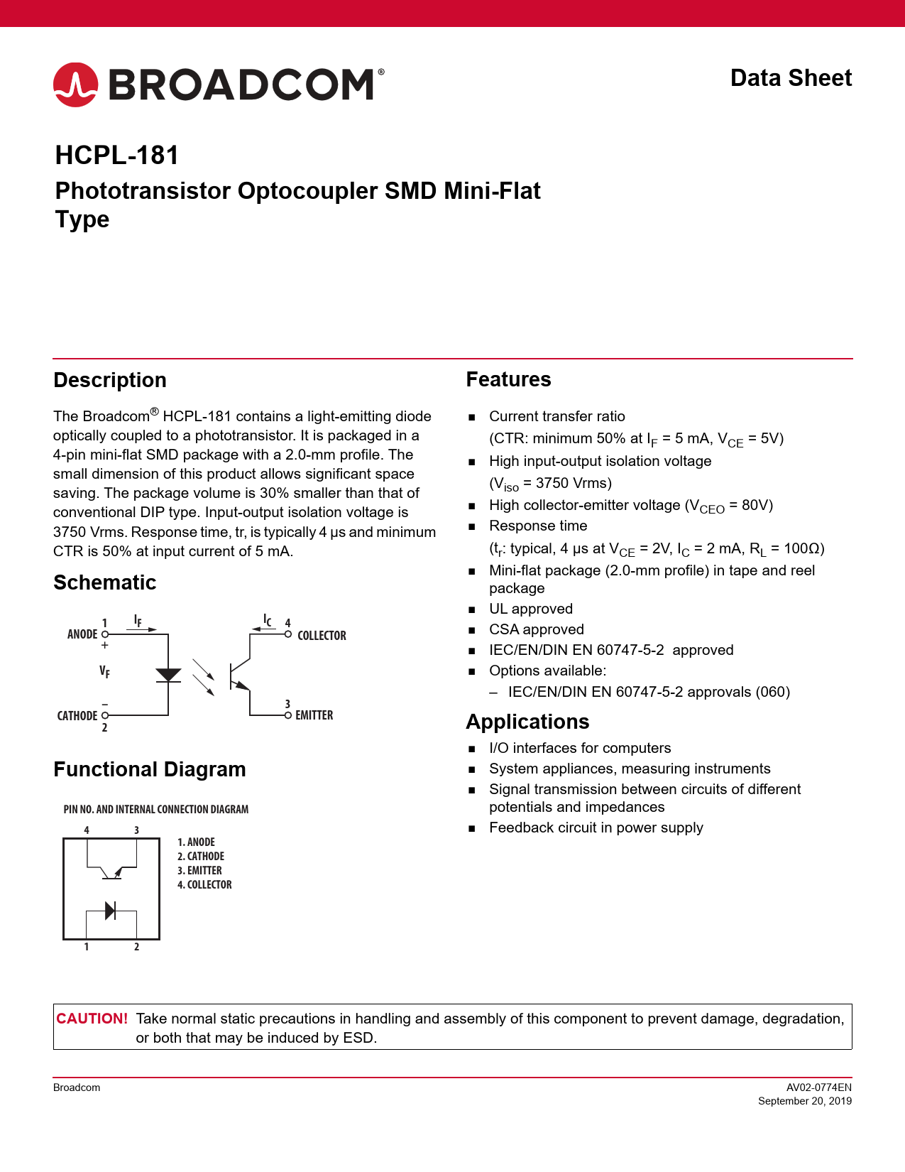 Take normal static precautions in handling and assembly of this component to prevent damage, degradation, or both that may be induced by ESD. Broadcom AV02-0774EN September 20, 2019 Document Outline Description Schematic Functional Diagram Features Applications Ordering Information Package Outline Drawings HCPL-181-000E HCPL-181-060E Solder Reflow Temperature Profile Absolute Maximum Ratings (TA = 25°C) Electrical Specifications (TA = 25°C) Test Circuit for Response Time Test Circuit for Frequency Response