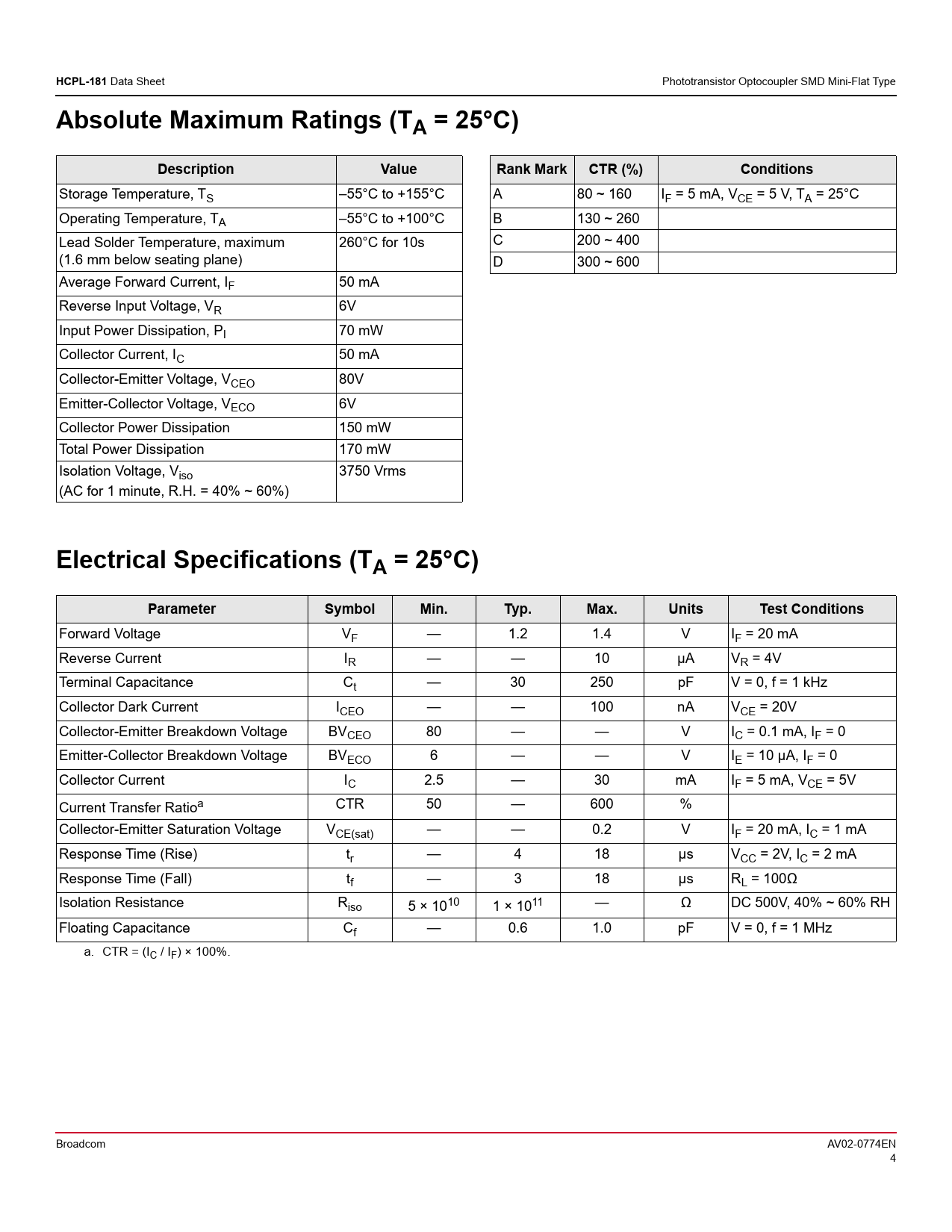 HCPL-181 Data Sheet Phototransistor Optocoupler SMD Mini-Flat Type Absolute Maximum Ratings (TA = 25°C)DescriptionValueRank MarkCTR (%)Conditions Storage Temperature, TS –55°C to +155°C A 80 ~ 160 IF = 5 mA, VCE = 5 V, TA = 25°C Operating Temperature, TA –55°C to +100°C B 130 ~ 260 Lead Solder Temperature, maximum 260°C for 10s C 200 ~ 400 (1.6 mm below seating plane) D 300 ~ 600 Average Forward Current, IF 50 mA Reverse Input Voltage, VR 6V Input Power Dissipation, PI 70 mW Collector Current, IC 50 mA Collector-Emitter Voltage, VCEO 80V Emitter-Collector Voltage, VECO 6V Collector Power Dissipation 150 mW Total Power Dissipation 170 mW Isolation Voltage, Viso 3750 Vrms (AC for 1 minute, R.H. = 40% ~ 60%) Electrical Specifications (TA = 25°C)ParameterSymbolMin.Typ.Max.UnitsTest Conditions Forward Voltage VF — 1.2 1.4 V IF = 20 mA Reverse Current IR — — 10 µA VR = 4V Terminal Capacitance Ct — 30 250 pF V = 0, f = 1 kHz Collector Dark Current ICEO — — 100 nA VCE = 20V Collector-Emitter Breakdown Voltage BVCEO 80 — — V IC = 0.1 mA, IF = 0 Emitter-Collector Breakdown Voltage BVECO 6 — — V IE = 10 µA, IF = 0 Collector Current IC 2.5 — 30 mA IF = 5 mA, VCE = 5V Current Transfer Ratioa CTR 50 — 600 % Collector-Emitter Saturation Voltage VCE(sat) — — 0.2 V IF = 20 mA, IC = 1 mA Response Time (Rise) tr — 4 18 µs VCC = 2V, IC = 2 mA Response Time (Fall) tf — 3 18 µs RL = 100Ω Isolation Resistance Riso 5 × 1010 1 × 1011 — Ω DC 500V, 40% ~ 60% RH Floating Capacitance Cf — 0.6 1.0 pF V = 0, f = 1 MHz a. CTR = (IC / IF) × 100%. Broadcom AV02-0774EN 4 Document Outline Description Schematic Functional Diagram Features Applications Ordering Information Package Outline Drawings HCPL-181-000E HCPL-181-060E Solder Reflow Temperature Profile Absolute Maximum Ratings (TA = 25°C) Electrical Specifications (TA = 25°C) Test Circuit for Response Time Test Circuit for Frequency Response