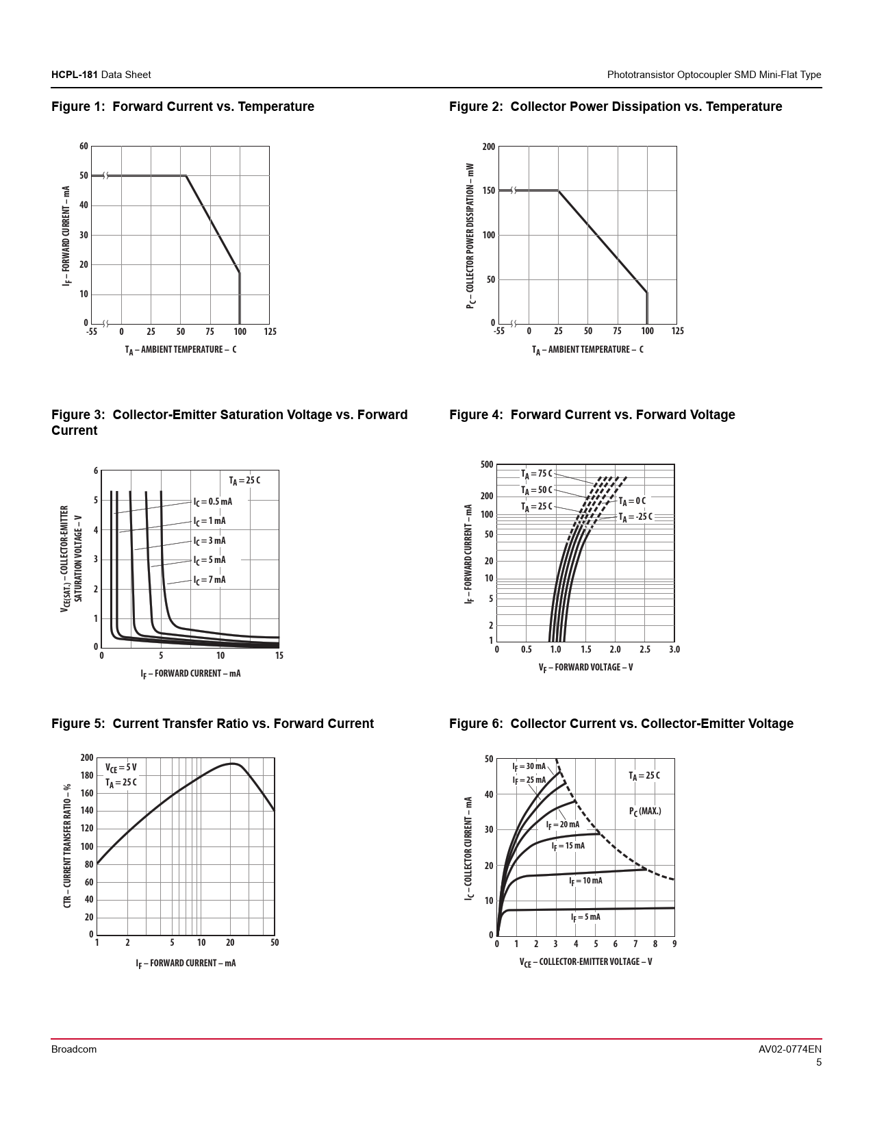 HCPL-181 Data Sheet Phototransistor Optocoupler SMD Mini-Flat Type Figure 1: Forward Current vs. TemperatureFigure 2: Collector Power Dissipation vs. Temperature6020050150403010020– FORWARD CURRENT – mA I F5010– COLLECTOR POWER DISSIPATION – mW P C00-550255075100125-550255075100125TA – AMBIENT TEMPERATURE – CTA – AMBIENT TEMPERATURE – CFigure 3: Collector-Emitter Saturation Voltage vs. ForwardFigure 4: Forward Current vs. Forward VoltageCurrent5006TTA = 75 CA = 25 CTA = 50 C5I200C = 0.5 mATTA = 0 CA = 25 C100ITC = 1 mAA = -25 C450IC = 3 mA3IC = 5 mA20– COLLECTOR-EMITTERIC = 7 mA102SATURATION VOLTAGE – V– FORWARD CURRENT – mA I F5V CE(SAT.)12 1000.51.01.52.02.53.0051015VIF – FORWARD VOLTAGE – VF – FORWARD CURRENT – mAFigure 5: Current Transfer Ratio vs. Forward CurrentFigure 6: Collector Current vs. Collector-Emitter Voltage20050VCE = 5 VIF = 30 mA180TTIA = 25 CA = 25 CF = 25 mA16040140PC (MAX.)120I30F = 20 mA100IF = 15 mA802060IF = 10 mA– COLLECTOR CURRENT – mA40I CCTR – CURRENT TRANSFER RATIO – %1020IF = 5 mA001251020500123456789IF – FORWARD CURRENT – mAVCE – COLLECTOR-EMITTER VOLTAGE – V Broadcom AV02-0774EN 5 Document Outline Description Schematic Functional Diagram Features Applications Ordering Information Package Outline Drawings HCPL-181-000E HCPL-181-060E Solder Reflow Temperature Profile Absolute Maximum Ratings (TA = 25°C) Electrical Specifications (TA = 25°C) Test Circuit for Response Time Test Circuit for Frequency Response