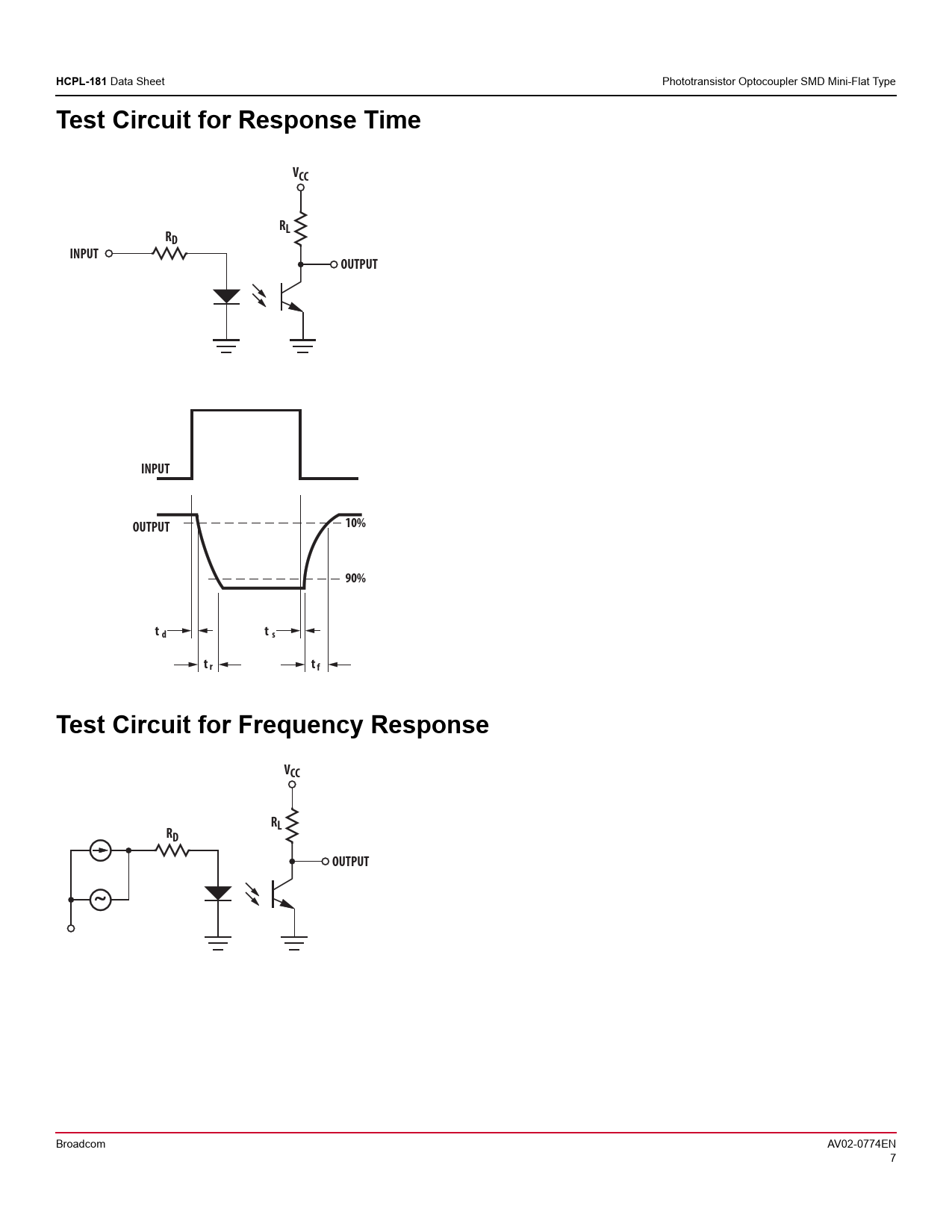 HCPL-181 Data Sheet Phototransistor Optocoupler SMD Mini-Flat Type Test Circuit for Response TimeVCCRLRDINPUTOUTPUTINPUTOUTPUT10%90%t dt st rt fTest Circuit for Frequency ResponseVCCRLRDOUTPUT~ Broadcom AV02-0774EN 7 Document Outline Description Schematic Functional Diagram Features Applications Ordering Information Package Outline Drawings HCPL-181-000E HCPL-181-060E Solder Reflow Temperature Profile Absolute Maximum Ratings (TA = 25°C) Electrical Specifications (TA = 25°C) Test Circuit for Response Time Test Circuit for Frequency Response