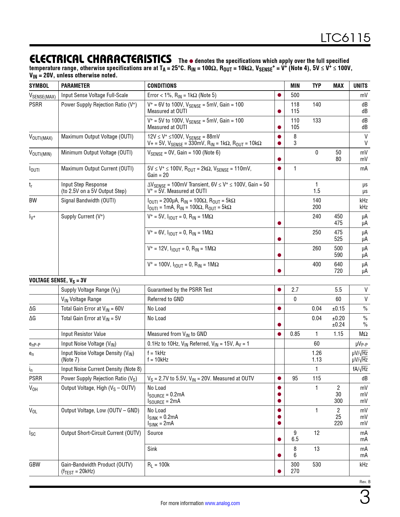 LTC6115 ELECTRICAL CHARACTERISTICSThe l denotes the specifications which apply over the full specifiedtemperature range, otherwise specifications are at T+A = 25°C. RIN = 100Ω, ROUT = 10kΩ, VSENSE = V+ (Note 4), 5V ≤ V+ ≤ 100V,VIN = 20V, unless otherwise noted.SYMBOLPARAMETERCONDITIONSMINTYPMAXUNITS VSENSE(MAX) Input Sense Voltage Full-Scale Error < 1%, RIN = 1kΩ (Note 5) l 500 mV PSRR Power Supply Rejection Ratio (V+) V+ = 6V to 100V, VSENSE = 5mV, Gain = 100 118 140 dB Measured at OUTI l 115 dB V+ = 5V to 100V, VSENSE = 5mV, Gain = 100 110 133 dB Measured at OUTI l 105 dB VOUTI(MAX) Maximum Output Voltage (OUTI) 12V ≤ V+ ≤100V, VSENSE = 88mV l 8 V V+ = 5V, VSENSE = 330mV, RIN = 1kΩ, ROUT = 10kΩ l 3 V VOUTI(MIN) Minimum Output Voltage (OUTI) VSENSE = 0V, Gain = 100 (Note 6) 0 50 mV l 80 mV IOUTI Maximum Output Current (OUTI) 5V ≤ V+ ≤ 100V, ROUT = 2kΩ, VSENSE = 110mV, l 1 mA Gain = 20 tr Input Step Response ∆VSENSE = 100mV Transient, 6V ≤ V+ ≤ 100V, Gain = 50 1 µs (to 2.5V on a 5V Output Step) V+ = 5V. Measured at OUTI 1.5 µs BW Signal Bandwidth (OUTI) IOUTI = 200µA, RIN = 100Ω, ROUT = 5kΩ 140 kHz IOUTI = 1mA, RIN = 100Ω, ROUT = 5kΩ 200 kHz IV+ Supply Current (V+) V+ = 5V, IIOUT = 0, RIN = 1MΩ 240 450 µA l 475 µA V+ = 6V, IIOUT = 0, RIN = 1MΩ 250 475 µA l 525 µA V+ = 12V, IIOUT = 0, RIN = 1MΩ 260 500 µA l 590 µA V+ = 100V, IIOUT = 0, RIN = 1MΩ 400 640 µA l 720 µA VOLTAGE SENSE, VS = 3V Supply Voltage Range (VS) Guaranteed by the PSRR Test l 2.7 5.5 V VIN Voltage Range Referred to GND 0 60 V �G Total Gain Error at VIN = 60V No Load l 0.04 ±0.15 % �G Total Gain Error at VIN = 5V No Load 0.04 ±0.20 % l ±0.24 % Input Resistor Value Measured from VIN to GND l 0.85 1 1.15 MΩ enP-P Input Noise Voltage (VIN) 0.1Hz to 10Hz, VIN Referred, VIN = 15V, AV = 1 60 µVP-P en Input Noise Voltage Density (VIN) f = 1kHz 1.26 μV/√Hz (Note 7) f = 10kHz 1.13 μV/√Hz in Input Noise Current Density (Note 8) 1 fA/√Hz PSRR Power Supply Rejection Ratio (VS) VS = 2.7V to 5.5V, VIN = 20V. Measured at OUTV l 95 115 dB VOH Output Voltage, High (VS – OUTV) No Load l 1 2 mV ISOURCE = 0.2mA l 30 mV ISOURCE = 2mA l 300 mV VOL Output Voltage, Low (OUTV – GND) No Load l 1 2 mV ISINK = 0.2mA l 25 mV ISINK = 2mA l 220 mV ISC Output Short-Circuit Current (OUTV) Source 9 12 mA l 6.5 mA Sink 8 13 mA l 6 mA GBW Gain-Bandwidth Product (OUTV) RL = 100k 300 530 kHz (fTEST = 20kHz) l 270 Rev. B For more information www.analog.com 3 Document Outline Features Applications Typical Application Description Absolute Maximum Ratings Order Information Electrical Characteristics Pin Configuration Current Sense Typical Performance Characteristics Voltage Sense Typical Performance Characteristics Pin Functions Block Diagram Applications Information: Current Sense Applications Information: Voltage Sense Typical Applications Package Description Revision History Typical Application Related Parts