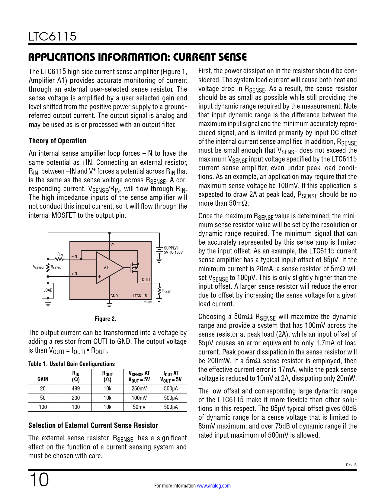 link to page 9 LTC6115 APPLICATIONS INFORMATION: CURRENT SENSE The LTC6115 high side current sense amplifier (Figure 1, First, the power dissipation in the resistor should be con- Amplifier A1) provides accurate monitoring of current sidered. The system load current will cause both heat and through an external user-selected sense resistor. The voltage drop in RSENSE. As a result, the sense resistor sense voltage is amplified by a user-selected gain and should be as small as possible while still providing the level shifted from the positive power supply to a ground- input dynamic range required by the measurement. Note referred output current. The output signal is analog and that input dynamic range is the difference between the may be used as is or processed with an output filter. maximum input signal and the minimum accurately repro- duced signal, and is limited primarily by input DC offset Theory of Operation of the internal current sense amplifier. In addition, RSENSE An internal sense amplifier loop forces –IN to have the must be small enough that VSENSE does not exceed the same potential as +IN. Connecting an external resistor, maximum VSENSE input voltage specified by the LTC6115 R current sense amplifier, even under peak load condi- IN, between –IN and V+ forces a potential across RIN that is the same as the sense voltage across R tions. As an example, an application may require that the SENSE. A cor- responding current, V maximum sense voltage be 100mV. If this application is SENSE/RIN, will flow through RIN. The high impedance inputs of the sense amplifier will expected to draw 2A at peak load, RSENSE should be no not conduct this input current, so it will flow through the more than 50mΩ. internal MOSFET to the output pin. Once the maximum RSENSE value is determined, the mini- mum sense resistor value will be set by the resolution or dynamic range required. The minimum signal that can V+ be accurately represented by this sense amp is limited SUPPLY1 5V TO 100V by the input offset. As an example, the LTC6115 current RIN –IN sense amplifier has a typical input offset of 85µV. If the VSENSE RSENSE A1 minimum current is 20mA, a sense resistor of 5mΩ will +IN OUTI set VSENSE to 100µV. This is only slightly higher than the input offset. A larger sense resistor will reduce the error LOAD ROUT GND LTC6115 due to offset by increasing the sense voltage for a given 6115 F02 load current. Figure 2. Choosing a 50mΩ RSENSE will maximize the dynamic range and provide a system that has 100mV across the The output current can be transformed into a voltage by sense resistor at peak load (2A), while an input offset of adding a resistor from OUTI to GND. The output voltage 85μV causes an error equivalent to only 1.7mA of load is then VOUTI = IOUTI • ROUTI. current. Peak power dissipation in the sense resistor will be 200mW. If a 5mΩ sense resistor is employed, then Table 1. Useful Gain Configurations the effective current error is 17mA, while the peak sense RINROUTVSENSE ATIOUT ATGAIN(Ω)(Ω)VOUT = 5VVOUT = 5V voltage is reduced to 10mV at 2A, dissipating only 20mW. 20 499 10k 250mV 500µA The low offset and corresponding large dynamic range 50 200 10k 100mV 500µA of the LTC6115 make it more flexible than other solu- 100 100 10k 50mV 500µA tions in this respect. The 85µV typical offset gives 60dB of dynamic range for a sense voltage that is limited to Selection of External Current Sense Resistor 85mV maximum, and over 75dB of dynamic range if the rated input maximum of 500mV is allowed. The external sense resistor, RSENSE, has a significant effect on the function of a current sensing system and must be chosen with care. Rev. B 10 For more information www.analog.com Document Outline Features Applications Typical Application Description Absolute Maximum Ratings Order Information Electrical Characteristics Pin Configuration Current Sense Typical Performance Characteristics Voltage Sense Typical Performance Characteristics Pin Functions Block Diagram Applications Information: Current Sense Applications Information: Voltage Sense Typical Applications Package Description Revision History Typical Application Related Parts