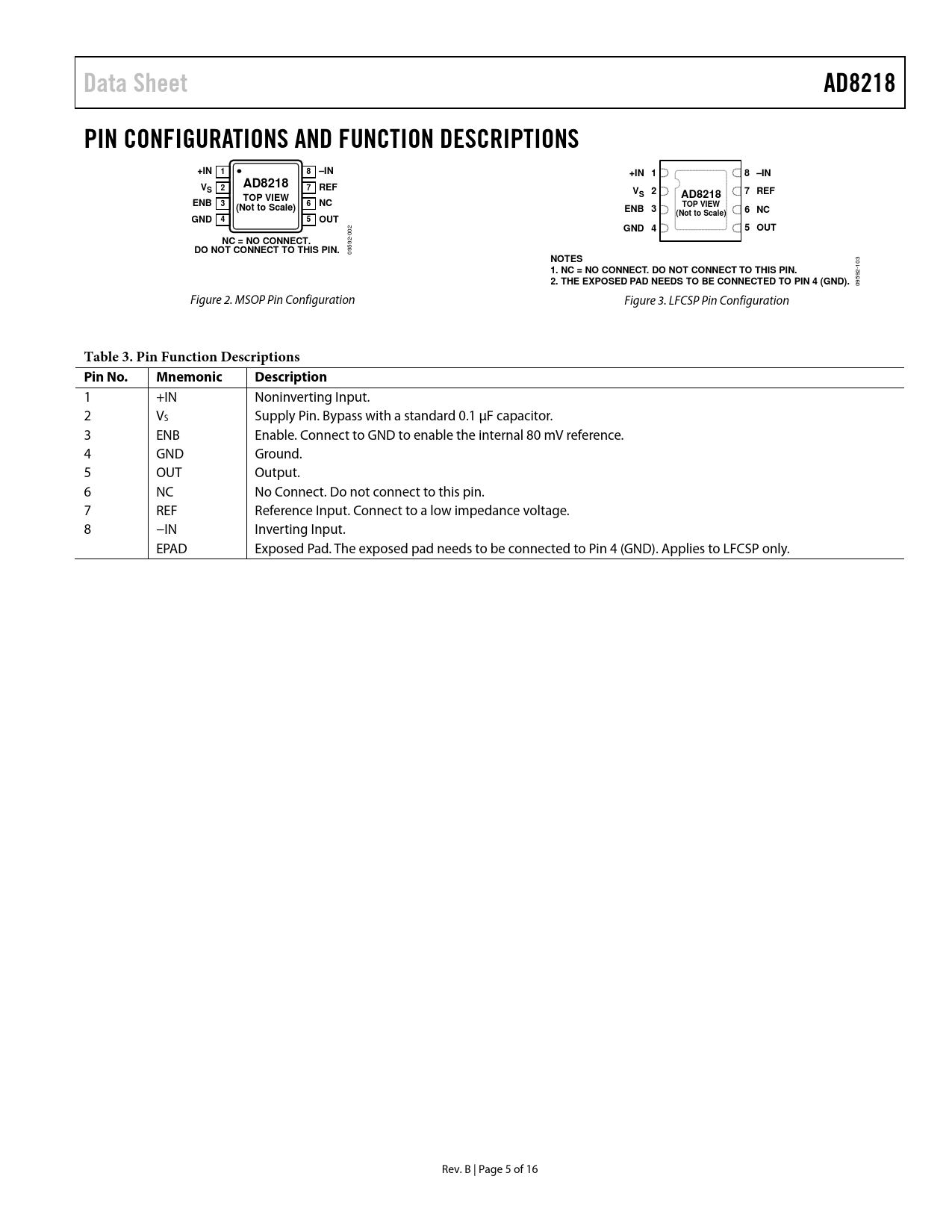 Data SheetAD8218PIN CONFIGURATIONS AND FUNCTION DESCRIPTIONS+IN18–IN+IN 18 –INVAD8218S27REFV27 REFTOP VIEWSAD8218ENB36NC(Not to Scale)TOP VIEWENB 36 NC(Not to Scale)GND45OUTGND 45 OUT 002 NC = NO CONNECT.DO NOT CONNECT TO THIS PIN. 09592- NOTES 103 1. NC = NO CONNECT. DO NOT CONNECT TO THIS PIN. 2. THE EXPOSED PAD NEEDS TO BE CONNECTED TO PIN 4 (GND). 09592- Figure 2. MSOP Pin Configuration Figure 3. LFCSP Pin Configuration Table 3. Pin Function Descriptions Pin No.MnemonicDescription 1 +IN Noninverting Input. 2 VS Supply Pin. Bypass with a standard 0.1 μF capacitor. 3 ENB Enable. Connect to GND to enable the internal 80 mV reference. 4 GND Ground. 5 OUT Output. 6 NC No Connect. Do not connect to this pin. 7 REF Reference Input. Connect to a low impedance voltage. 8 −IN Inverting Input. EPAD Exposed Pad. The exposed pad needs to be connected to Pin 4 (GND). Applies to LFCSP only. Rev. B | Page 5 of 16 Document Outline Features Applications Functional Block Diagram General Description Table of Contents Revision History Specifications Absolute Maximum Ratings ESD Caution Pin Configurations and Function Descriptions Typical Performance Characteristics Theory of Operation Amplifier Core Output Clamping Application Notes Supply (VS) Connections Enable Pin (ENB) Operation Applications Information Unidirectional High-Side Current Sensing Bidirectional High-Side Current Sensing Motor Control Current Sensing Outline Dimensions Ordering Guide