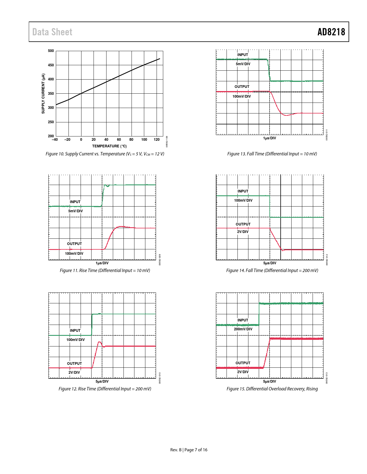 Data Sheet. AD8218. 500. INPUT. 450. 5mV/DIV. A) µ. 400. ( NT. OUTPUT. 350. 100mV/DIV. CURRE Y L PP. 300. 250. 200. 1µs/DIV. –40. –20. 100. 120. TEMPERATURE (°C)