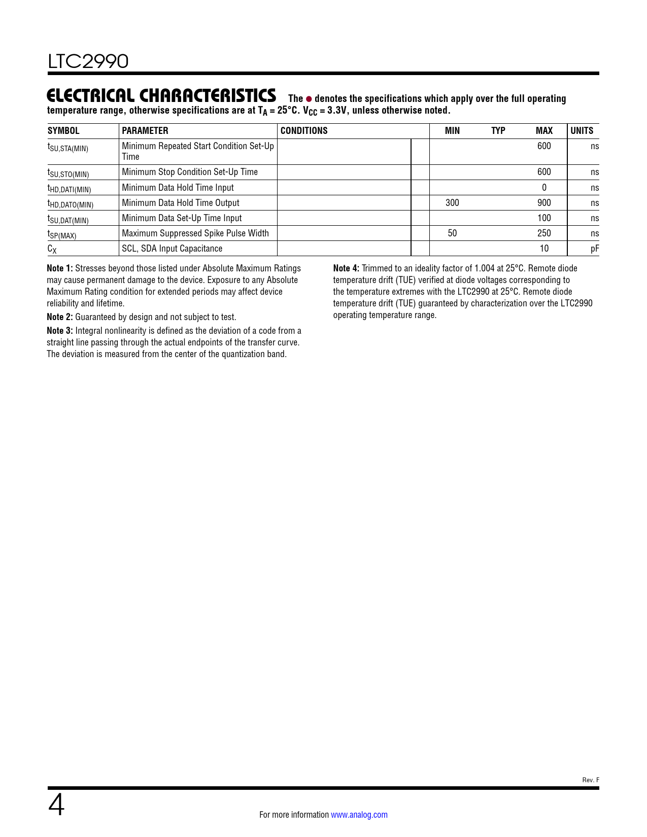 link to page 2 LTC2990 ELECTRICAL CHARACTERISTICS The l denotes the specifications which apply over the full operatingtemperature range, otherwise specifications are at TA = 25°C. VCC = 3.3V, unless otherwise noted.SYMBOLPARAMETERCONDITIONSMINTYPMAXUNITS tSU,STA(MIN) Minimum Repeated Start Condition Set-Up 600 ns Time tSU,STO(MIN) Minimum Stop Condition Set-Up Time 600 ns tHD,DATI(MIN) Minimum Data Hold Time Input 0 ns tHD,DATO(MIN) Minimum Data Hold Time Output 300 900 ns tSU,DAT(MIN) Minimum Data Set-Up Time Input 100 ns tSP(MAX) Maximum Suppressed Spike Pulse Width 50 250 ns CX SCL, SDA Input Capacitance 10 pF Note 1: Stresses beyond those listed under Absolute Maximum Ratings Note 4: Trimmed to an ideality factor of 1.004 at 25°C. Remote diode may cause permanent damage to the device. Exposure to any Absolute temperature drift (TUE) verified at diode voltages corresponding to Maximum Rating condition for extended periods may affect device the temperature extremes with the LTC2990 at 25°C. Remote diode reliability and lifetime. temperature drift (TUE) guaranteed by characterization over the LTC2990 Note 2: Guaranteed by design and not subject to test. operating temperature range. Note 3: Integral nonlinearity is defined as the deviation of a code from a straight line passing through the actual endpoints of the transfer curve. The deviation is measured from the center of the quantization band. Rev. F 4 For more information www.analog.com Document Outline Features Applications Typical Application Description Absolute Maximum Ratings Order Information Electrical Characteristics Pin Configuration Pin Functions Functional Diagram Timing Diagram Operation Applications Information Typical Applications Package Description Revision History Typical Application Related Parts