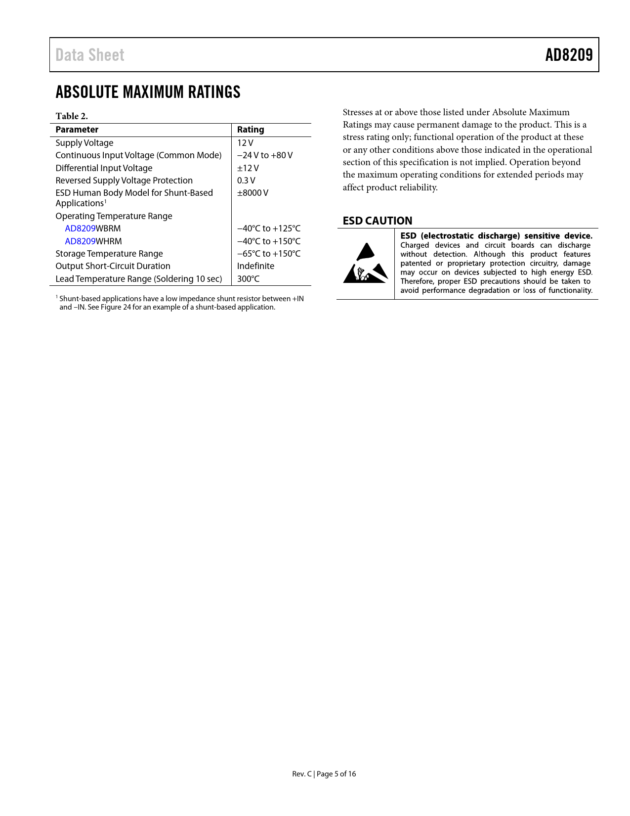 link to page 12 Data SheetAD8209ABSOLUTE MAXIMUM RATINGS Table 2. Stresses at or above those listed under Absolute Maximum ParameterRating Ratings may cause permanent damage to the product. This is a stress rating only; functional operation of the product at these Supply Voltage 12 V or any other conditions above those indicated in the operational Continuous Input Voltage (Common Mode) −24 V to +80 V section of this specification is not implied. Operation beyond Differential Input Voltage ±12 V the maximum operating conditions for extended periods may Reversed Supply Voltage Protection 0.3 V affect product reliability. ESD Human Body Model for Shunt-Based ±8000 V Applications1 Operating Temperature Range ESD CAUTION AD8209WBRM −40°C to +125°C AD8209WHRM −40°C to +150°C Storage Temperature Range −65°C to +150°C Output Short-Circuit Duration Indefinite Lead Temperature Range (Soldering 10 sec) 300°C 1 Shunt-based applications have a low impedance shunt resistor between +IN and –IN. See Figure 24 for an example of a shunt-based application. Rev. C | Page 5 of 16 Document Outline FEATURES APPLICATIONS FUNCTIONAL BLOCK DIAGRAM GENERAL DESCRIPTION REVISION HISTORY SPECIFICATIONS ABSOLUTE MAXIMUM RATINGS ESD CAUTION PIN CONFIGURATION AND FUNCTION DESCRIPTIONS TYPICAL PERFORMANCE CHARACTERISTICS THEORY OF OPERATION APPLICATIONS INFORMATION HIGH-SIDE CURRENT SENSINGWITH A LOW-SIDE SWITCH HIGH-RAIL CURRENT SENSING LOW-SIDE CURRENT SENSING 4 mA to 20 mA Current Loop Receiver GAIN ADJUSTMENT Gains Less than 14 Gains Greater than 14 GAIN TRIM Internal Signal Overload Considerations LOW-PASS FILTERING HIGH LINE CURRENT SENSINGWITH LPF AND GAIN ADJUSTMENT OUTLINE DIMENSIONS ORDERING GUIDE AUTOMOTIVE PRODUCTS