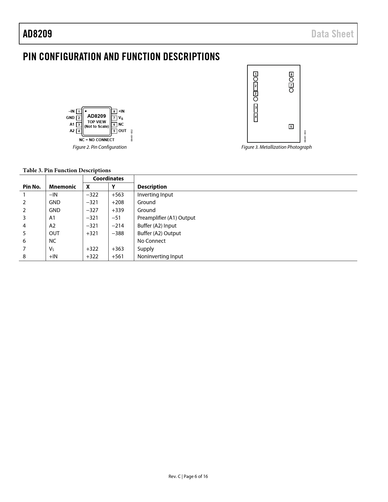 AD8209Data SheetPIN CONFIGURATION AND FUNCTION DESCRIPTIONS182723–IN 18 +INGNDAD820927 V4STOP VIEWA1 36 NC(Not to Scale)5A2 45 OUT 02 3 0 1- -00 NC = NO CONNECT 46 461 08 08 Figure 2. Pin Configuration Figure 3. Metallization Photograph Table 3. Pin Function DescriptionsCoordinatesPin No.MnemonicXYDescription 1 −IN −322 +563 Inverting Input 2 GND −321 +208 Ground 2 GND −327 +339 Ground 3 A1 −321 −51 Preamplifier (A1) Output 4 A2 −321 −214 Buffer (A2) Input 5 OUT +321 −388 Buffer (A2) Output 6 NC No Connect 7 VS +322 +363 Supply 8 +IN +322 +561 Noninverting Input Rev. C | Page 6 of 16 Document Outline FEATURES APPLICATIONS FUNCTIONAL BLOCK DIAGRAM GENERAL DESCRIPTION REVISION HISTORY SPECIFICATIONS ABSOLUTE MAXIMUM RATINGS ESD CAUTION PIN CONFIGURATION AND FUNCTION DESCRIPTIONS TYPICAL PERFORMANCE CHARACTERISTICS THEORY OF OPERATION APPLICATIONS INFORMATION HIGH-SIDE CURRENT SENSINGWITH A LOW-SIDE SWITCH HIGH-RAIL CURRENT SENSING LOW-SIDE CURRENT SENSING 4 mA to 20 mA Current Loop Receiver GAIN ADJUSTMENT Gains Less than 14 Gains Greater than 14 GAIN TRIM Internal Signal Overload Considerations LOW-PASS FILTERING HIGH LINE CURRENT SENSINGWITH LPF AND GAIN ADJUSTMENT OUTLINE DIMENSIONS ORDERING GUIDE AUTOMOTIVE PRODUCTS