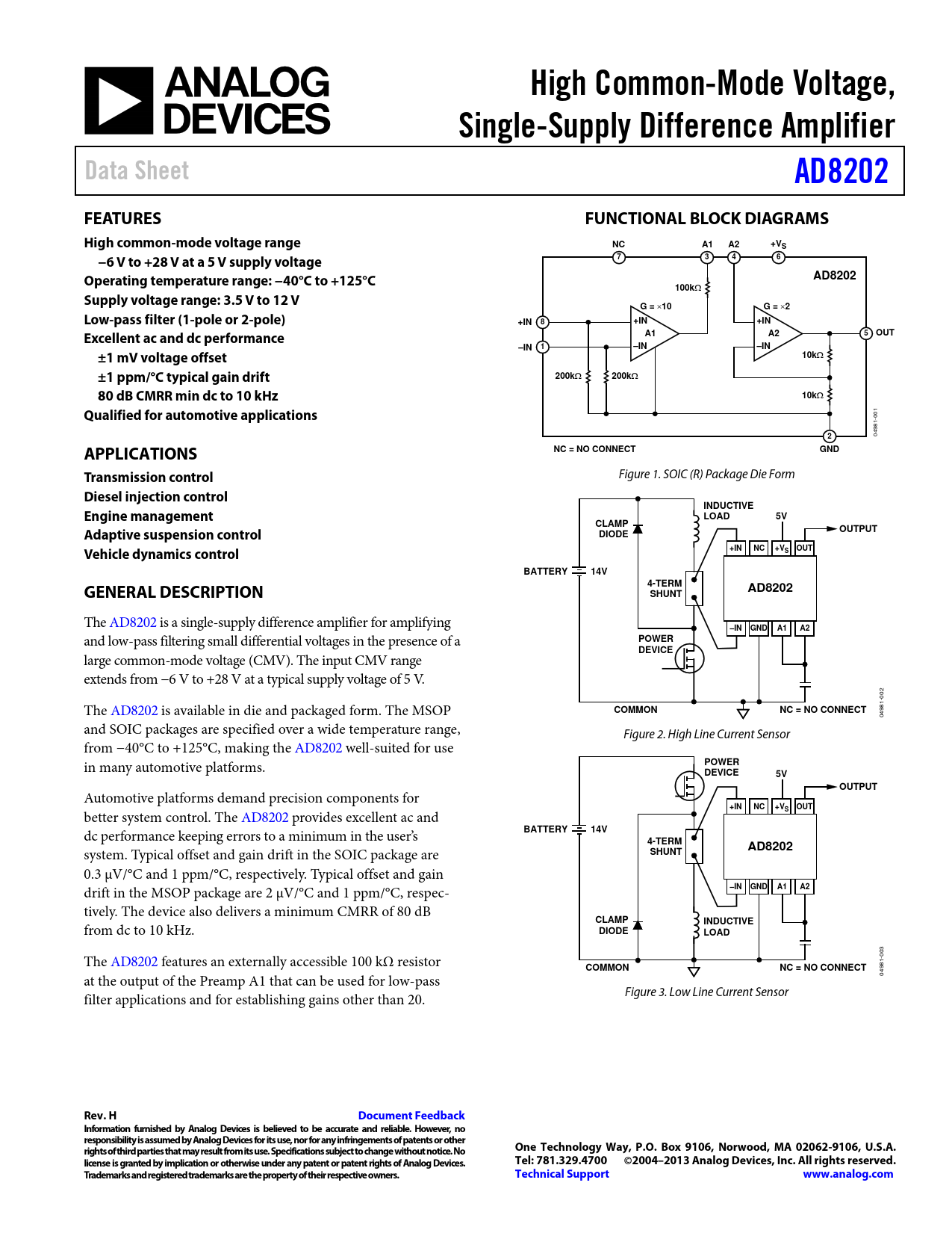 04981-002 and SOIC packages are specified over a wide temperature range, Figure 2. High Line Current Sensor from −40°C to +125°C, making the AD8202 wel -suited for use in many automotive platforms.