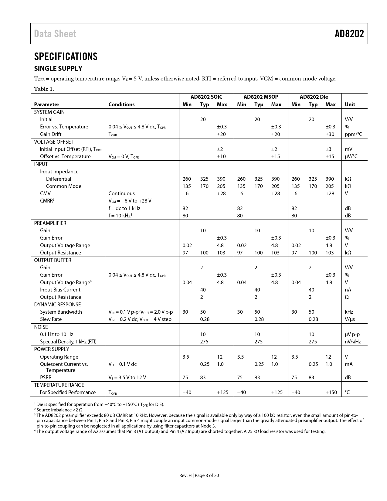link to page 3 link to page 3 link to page 3 link to page 3 Data SheetAD8202SPECIFICATIONS SINGLE SUPPLY TOPR = operating temperature range, VS = 5 V, unless otherwise noted, RTI = referred to input, VCM = common-mode voltage. Table 1.AD8202 SOICAD8202 MSOPAD8202 Die1ParameterConditionsMin Typ Max Min Typ Max Min Typ Max Unit SYSTEM GAIN Initial 20 20 20 V/V Error vs. Temperature 0.04 ≤ VOUT ≤ 4.8 V dc, TOPR ±0.3 ±0.3 ±0.3 % Gain Drift TOPR ±20 ±20 ±30 ppm/°C VOLTAGE OFFSET Initial Input Offset (RTI), TOPR ±2 ±2 ±3 mV Offset vs. Temperature VCM = 0 V, TOPR ±10 ±15 ±15 μV/°C INPUT Input Impedance Differential 260 325 390 260 325 390 260 325 390 kΩ Common Mode 135 170 205 135 170 205 135 170 205 kΩ CMV Continuous −6 +28 −6 +28 −6 +28 V CMRR2 VCM = −6 V to +28 V f = dc to 1 kHz 82 82 82 dB f = 10 kHz3 80 80 80 dB PREAMPLIFIER Gain 10 10 10 V/V Gain Error ±0.3 ±0.3 ±0.3 % Output Voltage Range 0.02 4.8 0.02 4.8 0.02 4.8 V Output Resistance 97 100 103 97 100 103 97 100 103 kΩ OUTPUT BUFFER Gain 2 2 2 V/V Gain Error 0.04 ≤ VOUT ≤ 4.8 V dc, TOPR ±0.3 ±0.3 ±0.3 % Output Voltage Range4 0.04 4.8 0.04 4.8 0.04 4.8 V Input Bias Current 40 40 40 nA Output Resistance 2 2 2 Ω DYNAMIC RESPONSE System Bandwidth VIN = 0.1 V p-p; VOUT = 2.0 V p-p 30 50 30 50 30 50 kHz Slew Rate VIN = 0.2 V dc; VOUT = 4 V step 0.28 0.28 0.28 V/μs NOISE 0.1 Hz to 10 Hz 10 10 10 μV p-p Spectral Density, 1 kHz (RTI) 275 275 275 nV/√Hz POWER SUPPLY Operating Range 3.5 12 3.5 12 3.5 12 V Quiescent Current vs. VO = 0.1 V dc 0.25 1.0 0.25 1.0 0.25 1.0 mA Temperature PSRR VS = 3.5 V to 12 V 75 83 75 83 75 83 dB TEMPERATURE RANGE For Specified Performance TOPR −40 +125 −40 +125 −40 +150 °C 1 Die is specified for operation from −40°C to +150°C ( TOPR for DIE). 2 Source imbalance <2 Ω. 3 The AD8202 preamplifier exceeds 80 dB CMRR at 10 kHz. However, because the signal is available only by way of a 100 kΩ resistor, even the small amount of pin-to- pin capacitance between Pin 1, Pin 8 and Pin 3, Pin 4 might couple an input common-mode signal larger than the greatly attenuated preamplifier output. The effect of pin-to-pin coupling can be neglected in all applications by using filter capacitors at Node 3. 4 The output voltage range of A2 assumes that Pin 3 (A1 output) and Pin 4 (A2 Input) are shorted together. A 25 kΩ load resistor was used for testing. Rev. H | Page 3 of 20 Document Outline Features Applications General Description Functional Block Diagrams Revision History Specifications Single Supply Absolute Maximum Ratings ESD Caution Pin Configuration and Function Descriptions Typical Performance Characteristics Theory of Operation Applications Current Sensing High Line, High Current Sensing Low Current Sensing Gain Adjustment Gains Less than 20 Gains Greater Than 20 Gain Trim Internal Signal Overload Considerations Low-Pass Filtering High Line Current Sensing with LPF and Gain Adjustment Driving Charge Redistribution ADCs Outline Dimensions Ordering Guide Automotive Products