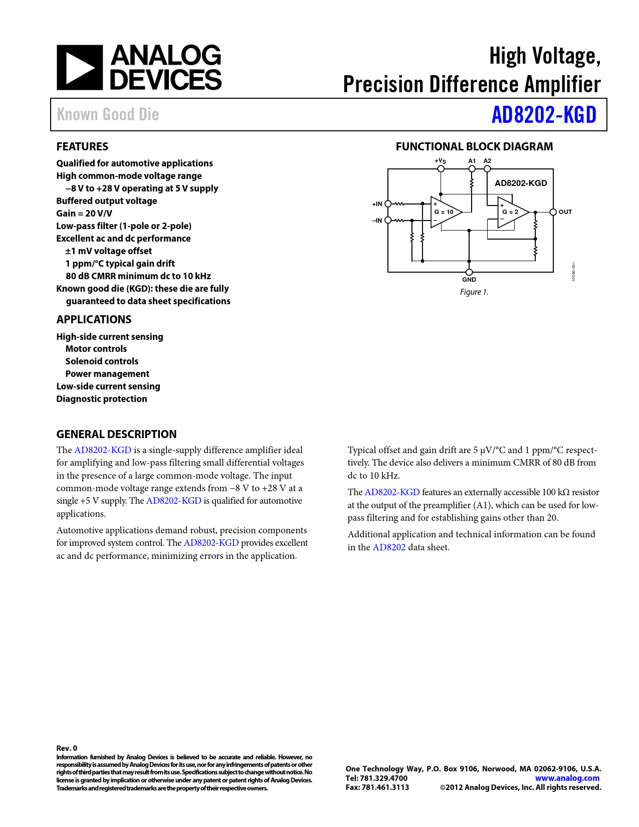 High Voltage,. Precision Difference Amplifier. Known Good Die. AD8202-KGD. FEATURES. FUNCTIONAL BLOCK DIAGRAM