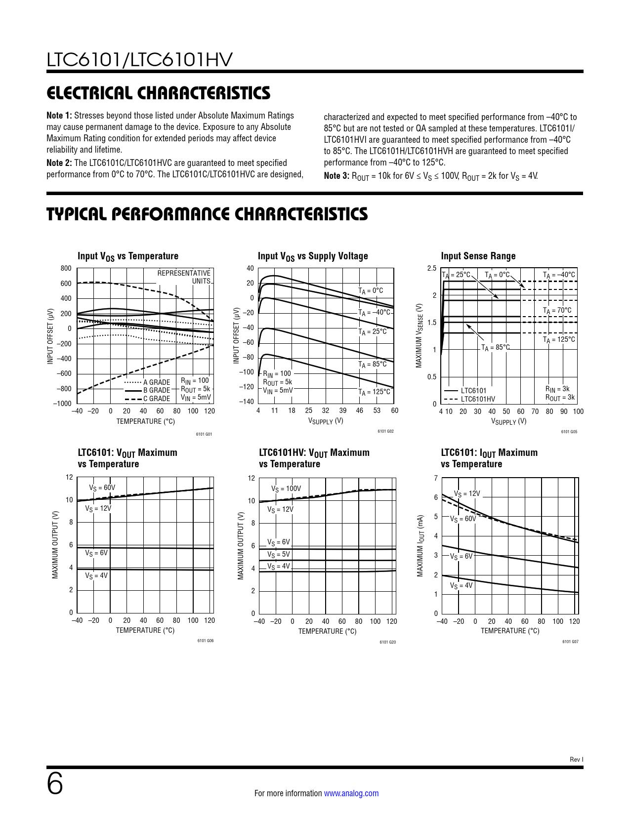 Stresses beyond those listed under Absolute Maximum Ratings characterized and expected to meet specified performance from –40°C to may cause permanent damage to the device. Exposure to any Absolute 85°C but are not tested or QA sampled at these temperatures. LTC6101I/ Maximum Rating condition for extended periods may affect device LTC6101HVI are guaranteed to meet specified performance from –40°C reliability and lifetime. to 85°C. The LTC6101H/LTC6101HVH are guaranteed to meet specified