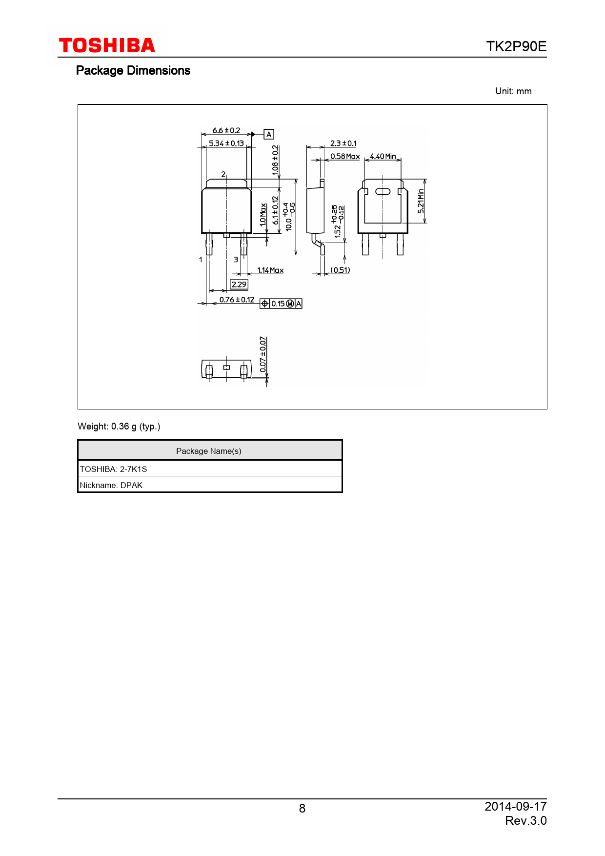 TK2P90E. Package. Dimensions. Unit:. mm. Weight:. 0.36. g. (typ.). Package. Name(s). TOSHIBA:. 2-7K1S. Nickname:. DPAK. 8. 2014-09-17. Rev.3.0