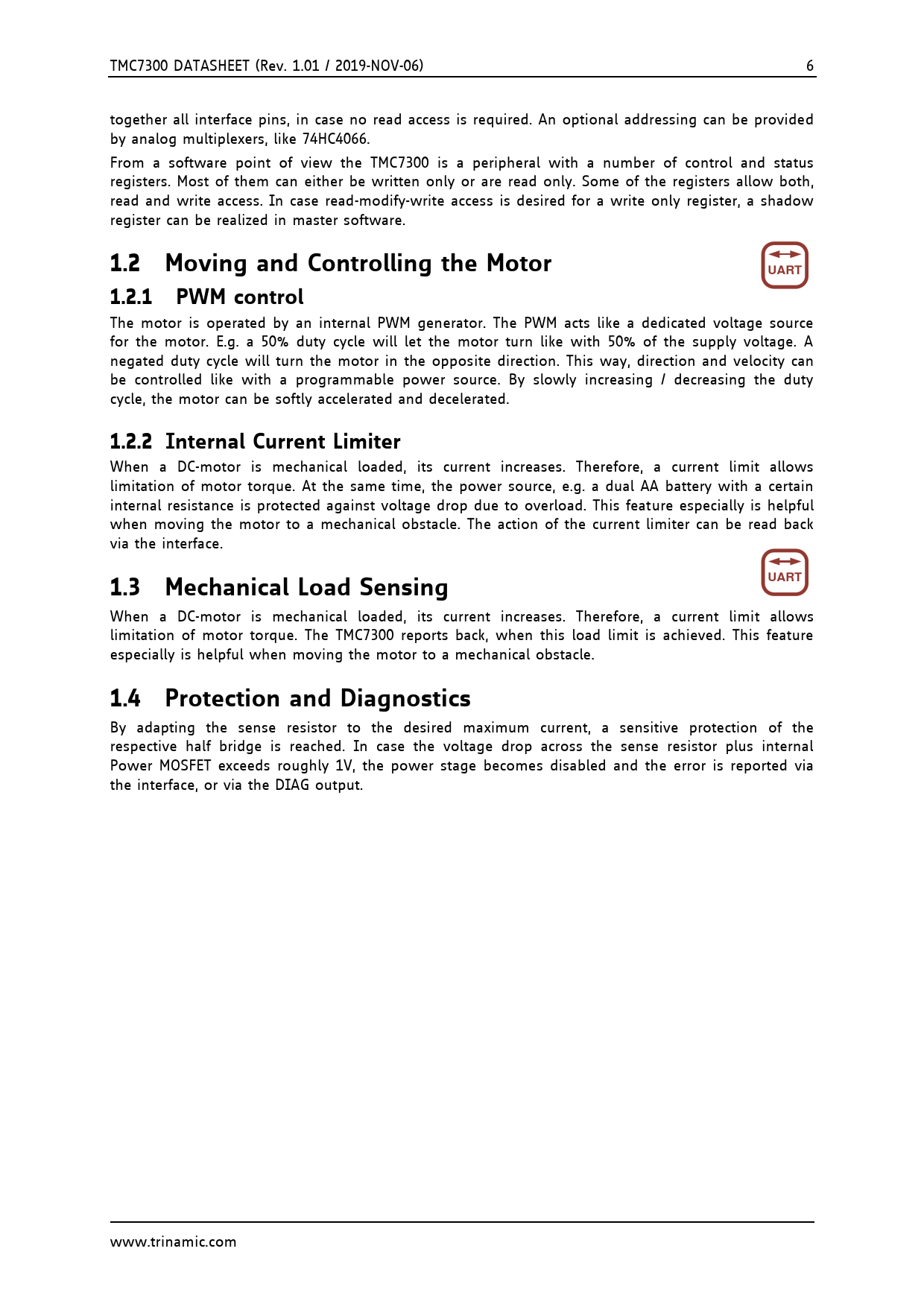TMC7300 DATASHEET (Rev. 1.01 / 2019-NOV-06) 6 together all interface pins, in case no read access is required. An optional addressing can be provided by analog multiplexers, like 74HC4066. From a software point of view the TMC7300 is a peripheral with a number of control and status registers. Most of them can either be written only or are read only. Some of the registers allow both, read and write access. In case read-modify-write access is desired for a write only register, a shadow register can be realized in master software. 1.2 Moving and Controlling the MotorUART1.2.1 PWM control The motor is operated by an internal PWM generator. The PWM acts like a dedicated voltage source for the motor. E.g. a 50% duty cycle will let the motor turn like with 50% of the supply voltage. A negated duty cycle will turn the motor in the opposite direction. This way, direction and velocity can be controlled like with a programmable power source. By slowly increasing / decreasing the duty cycle, the motor can be softly accelerated and decelerated. 1.2.2 Internal Current Limiter When a DC-motor is mechanical loaded, its current increases. Therefore, a current limit allows limitation of motor torque. At the same time, the power source, e.g. a dual AA battery with a certain internal resistance is protected against voltage drop due to overload. This feature especially is helpful when moving the motor to a mechanical obstacle. The action of the current limiter can be read back via the interface. 1.3 Mechanical Load SensingUART When a DC-motor is mechanical loaded, its current increases. Therefore, a current limit allows limitation of motor torque. The TMC7300 reports back, when this load limit is achieved. This feature especially is helpful when moving the motor to a mechanical obstacle. 1.4 Protection and Diagnostics By adapting the sense resistor to the desired maximum current, a sensitive protection of the respective half bridge is reached. In case the voltage drop across the sense resistor plus internal Power MOSFET exceeds roughly 1V, the power stage becomes disabled and the error is reported via the interface, or via the DIAG output. www.trinamic.com