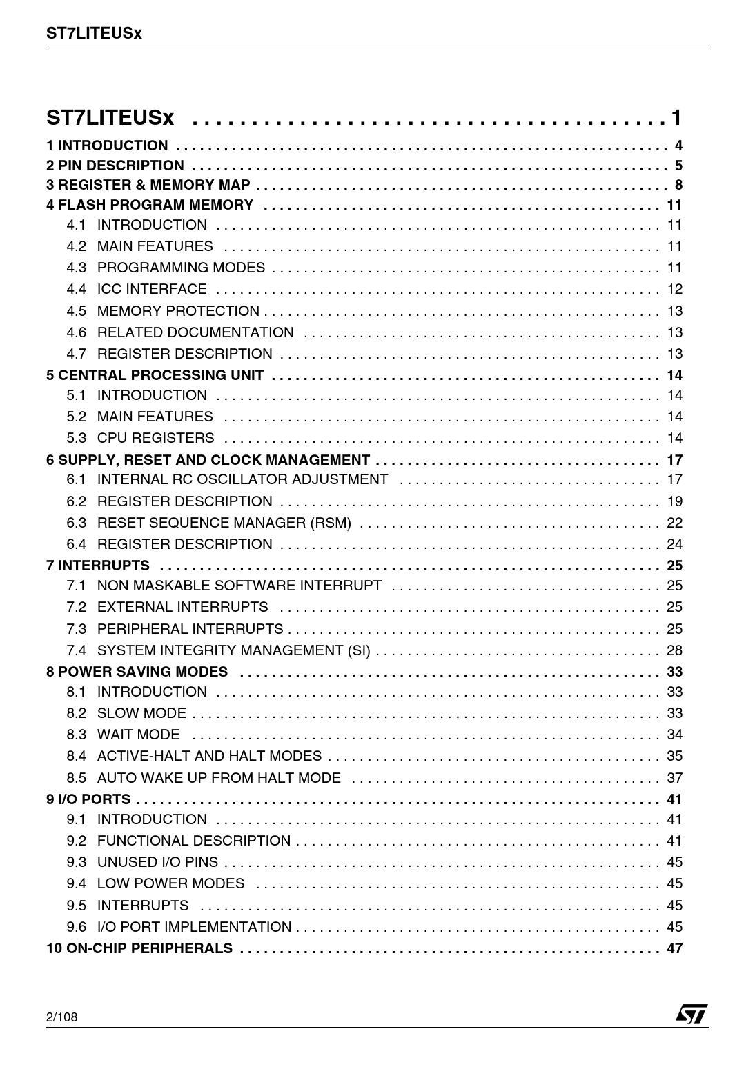 ST7LITEUSx. ST7LITEUSx . 1 ST7LITEUSx. 1 INTRODUCTION. .. . ... . 1. . 4. 2 IN. PITRO. N D DUCTI. ESCRI ON. PTIO .. N .. 3 PI. R N D. EGI ESCRIPTIO