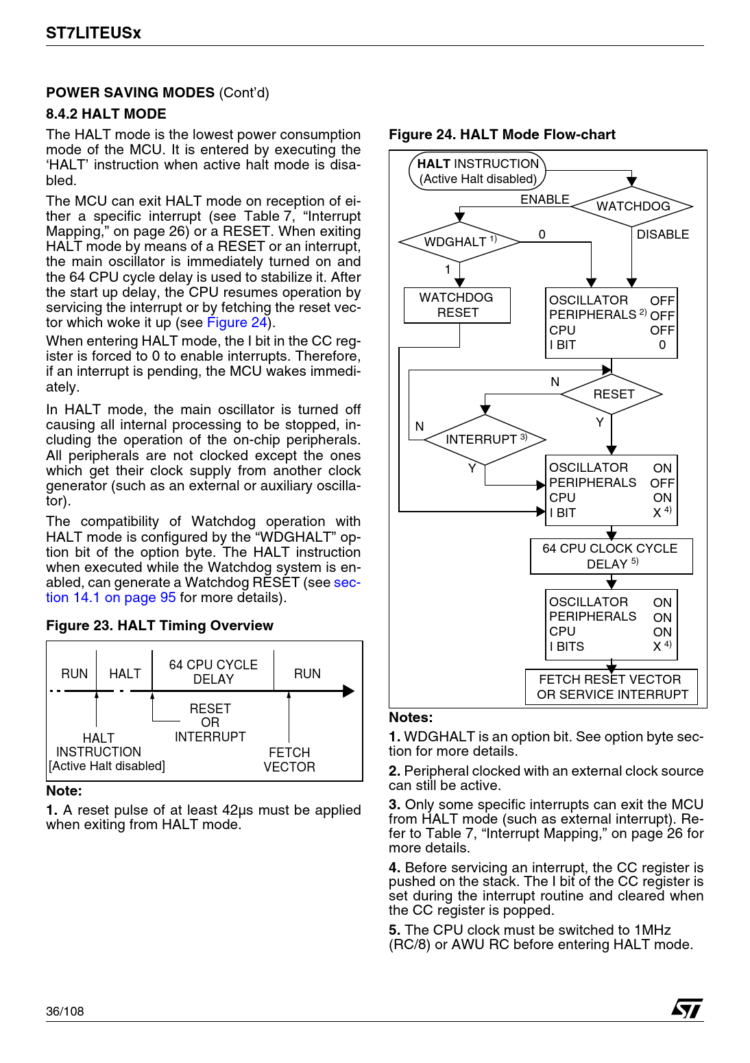 ST7LITEUSx. POWER SAVING MODES. 8.4.2 HALT MODE. Figure 24. HALT Mode Flow-chart. HALT. Figure 23. HALT Timing Overview. Notes:
