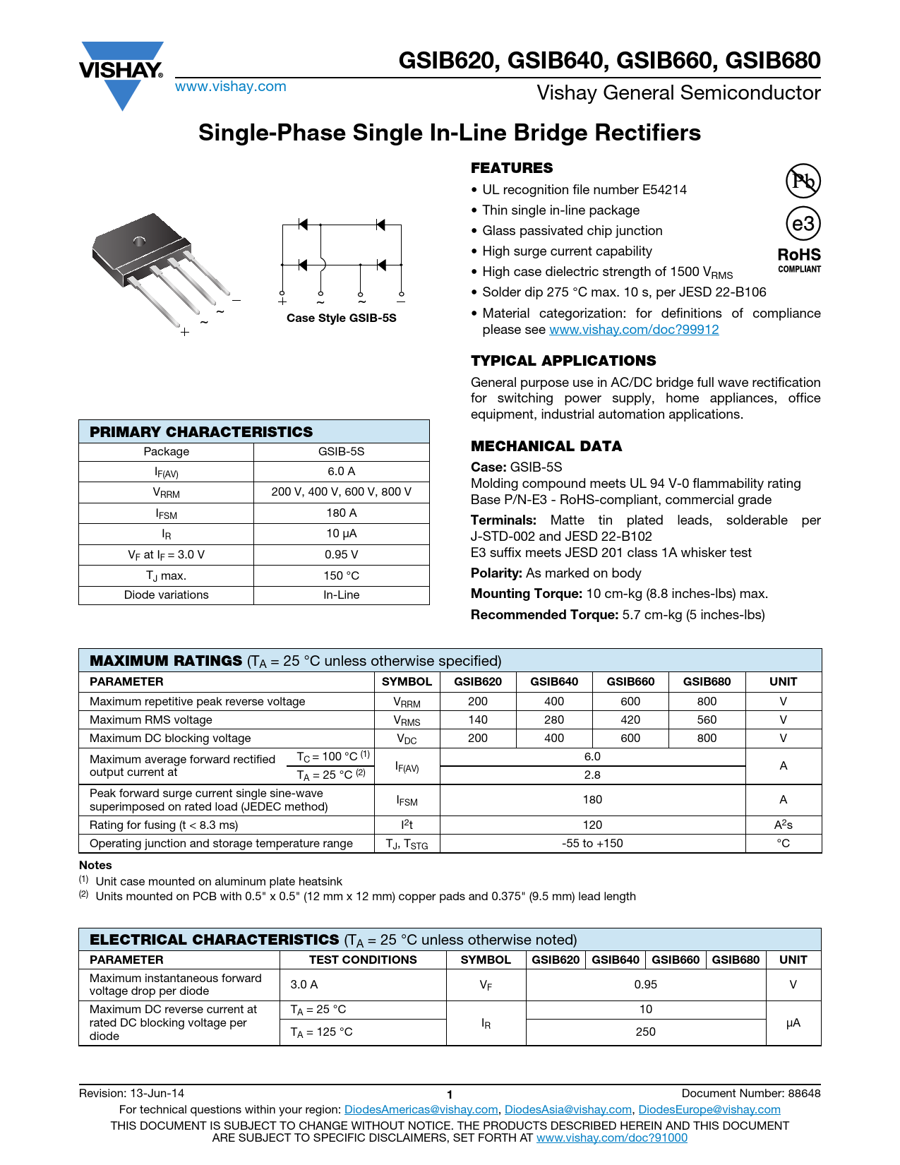 GSIB620, GSIB640, GSIB660, GSIB680 www.vishay.com Vishay General Semiconductor Single-Phase Single In-Line Bridge RectifiersFEATURES • UL recognition file number E54214 • Thin single in-line package • Glass passivated chip junction • High surge current capability • High case dielectric strength of 1500 VRMS • Solder dip 275 °C max. 10 s, per JESD 22-B106 ~ ~ ~ • Material categorization: for definitions of compliance Case Style GSIB-5S ~ please see www.vishay.com/doc?99912 TYPICAL APPLICATIONS General purpose use in AC/DC bridge full wave rectification for switching power supply, home appliances, office equipment, industrial automation applications. PRIMARY CHARACTERISTICSMECHANICAL DATA Package GSIB-5S Case: GSIB-5S IF(AV) 6.0 A Molding compound meets UL 94 V-0 flammability rating VRRM 200 V, 400 V, 600 V, 800 V Base P/N-E3 - RoHS-compliant, commercial grade IFSM 180 A Terminals: Matte tin plated leads, solderable per IR 10 μA J-STD-002 and JESD 22-B102 V E3 suffix meets JESD 201 class 1A whisker test F at IF = 3.0 V 0.95 V T Polarity: As marked on body J max. 150 °C Diode variations In-Line Mounting Torque: 10 cm-kg (8.8 inches-lbs) max. Recommended Torque: 5.7 cm-kg (5 inches-lbs) MAXIMUM RATINGS (TA = 25 °C unless otherwise specified) PARAMETER SYMBOLGSIB620GSIB640 GSIB660 GSIB680 UNIT Maximum repetitive peak reverse voltage VRRM 200 400 600 800 V Maximum RMS voltage VRMS 140 280 420 560 V Maximum DC blocking voltage VDC 200 400 600 800 V Maximum average forward rectified TC = 100 °C (1) 6.0 I A output current at F(AV) TA = 25 °C (2) 2.8 Peak forward surge current single sine-wave I superimposed on rated load (JEDEC method) FSM 180 A Rating for fusing (t < 8.3 ms) I2t 120 A2s Operating junction and storage temperature range TJ, TSTG -55 to +150 °C Notes (1) Unit case mounted on aluminum plate heatsink (2) Units mounted on PCB with 0.5" x 0.5" (12 mm x 12 mm) copper pads and 0.375" (9.5 mm) lead length ELECTRICAL CHARACTERISTICS (TA = 25 °C unless otherwise noted) PARAMETERTEST CONDITIONSSYMBOLGSIB620 GSIB640 GSIB660 GSIB680 UNIT Maximum instantaneous forward 3.0 A V voltage drop per diode F 0.95 V Maximum DC reverse current at TA = 25 °C 10 rated DC blocking voltage per IR μA diode TA = 125 °C 250 Revision: 13-Jun-14 1 Document Number: 88648 For technical questions within your region: DiodesAmericas@vishay.com, DiodesAsia@vishay.com, DiodesEurope@vishay.com THIS DOCUMENT IS SUBJECT TO CHANGE WITHOUT NOTICE. THE PRODUCTS DESCRIBED HEREIN AND THIS DOCUMENT ARE SUBJECT TO SPECIFIC DISCLAIMERS, SET FORTH AT www.vishay.com/doc?91000