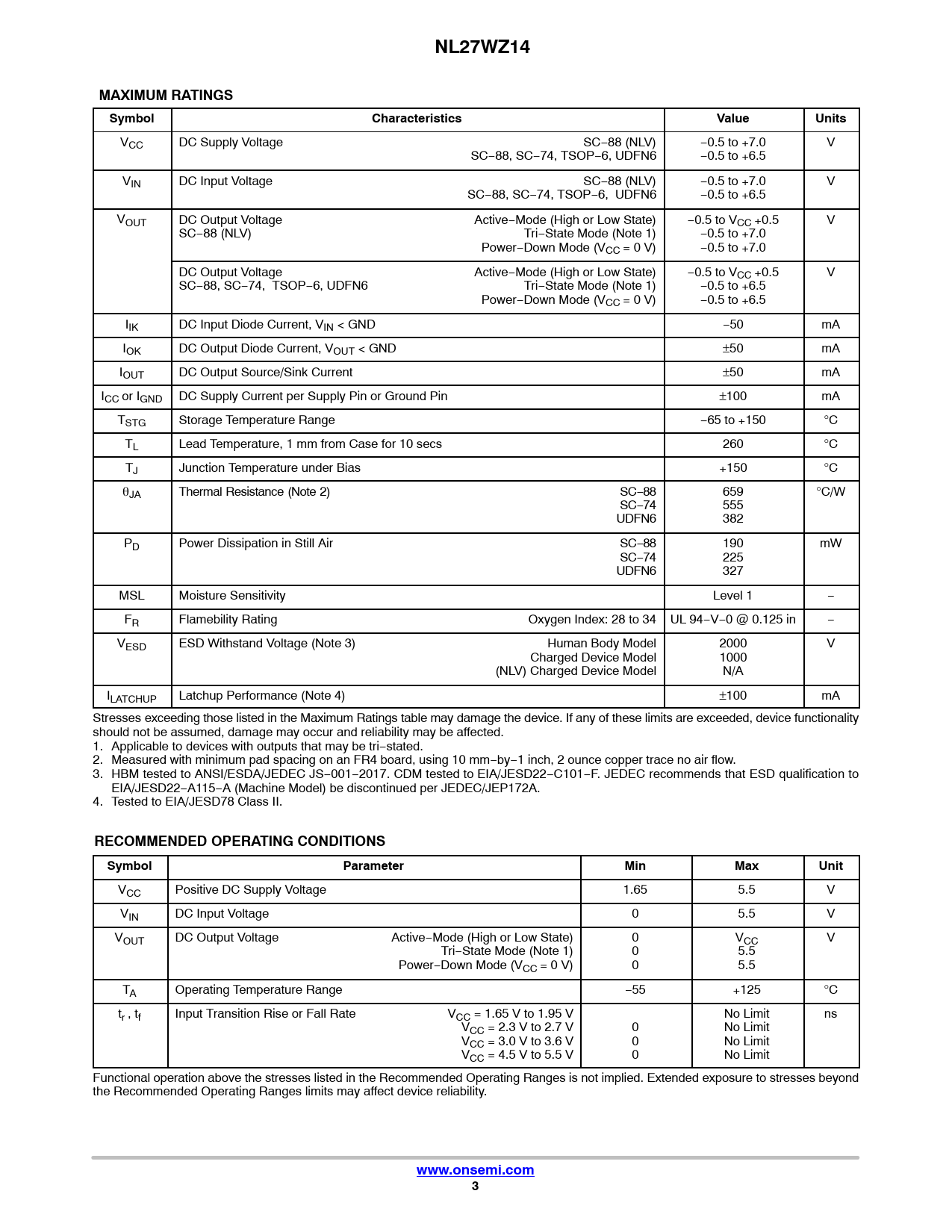 link to page 3 link to page 3 link to page 3 link to page 3 link to page 3 link to page 3 NL27WZ14MAXIMUM RATINGSSymbolCharacteristicsValueUnits VCC DC Supply Voltage SC−88 (NLV) −0.5 to +7.0 V SC−88, SC−74, TSOP−6, UDFN6 −0.5 to +6.5 VIN DC Input Voltage SC−88 (NLV) −0.5 to +7.0 V SC−88, SC−74, TSOP−6, UDFN6 −0.5 to +6.5 VOUT DC Output Voltage Active−Mode (High or Low State) −0.5 to VCC +0.5 V SC−88 (NLV) Tri−State Mode (Note 1) −0.5 to +7.0 Power−Down Mode (VCC = 0 V) −0.5 to +7.0 DC Output Voltage Active−Mode (High or Low State) −0.5 to VCC +0.5 V SC−88, SC−74, TSOP−6, UDFN6 Tri−State Mode (Note 1) −0.5 to +6.5 Power−Down Mode (VCC = 0 V) −0.5 to +6.5 IIK DC Input Diode Current, VIN < GND −50 mA IOK DC Output Diode Current, VOUT < GND ±50 mA IOUT DC Output Source/Sink Current ±50 mA ICC or IGND DC Supply Current per Supply Pin or Ground Pin ±100 mA TSTG Storage Temperature Range −65 to +150 °C TL Lead Temperature, 1 mm from Case for 10 secs 260 °C TJ Junction Temperature under Bias +150 °C qJA Thermal Resistance (Note 2) SC−88 659 °C/W SC−74 555 UDFN6 382 PD Power Dissipation in Still Air SC−88 190 mW SC−74 225 UDFN6 327 MSL Moisture Sensitivity Level 1 − FR Flamebility Rating Oxygen Index: 28 to 34 UL 94−V−0 @ 0.125 in − VESD ESD Withstand Voltage (Note 3) Human Body Model 2000 V Charged Device Model 1000 (NLV) Charged Device Model N/A ILATCHUP Latchup Performance (Note 4) ±100 mA Stresses exceeding those listed in the Maximum Ratings table may damage the device. If any of these limits are exceeded, device functionality should not be assumed, damage may occur and reliability may be affected. 1. Applicable to devices with outputs that may be tri−stated. 2. Measured with minimum pad spacing on an FR4 board, using 10 mm−by−1 inch, 2 ounce copper trace no air flow. 3. HBM tested to ANSI/ESDA/JEDEC JS−001−2017. CDM tested to EIA/JESD22−C101−F. JEDEC recommends that ESD qualification to EIA/JESD22−A115−A (Machine Model) be discontinued per JEDEC/JEP172A. 4. Tested to EIA/JESD78 Class II. RECOMMENDED OPERATING CONDITIONSSymbolParameterMinMaxUnit VCC Positive DC Supply Voltage 1.65 5.5 V VIN DC Input Voltage 0 5.5 V VOUT DC Output Voltage Active−Mode (High or Low State) 0 VCC V Tri−State Mode (Note 1) 0 5.5 Power−Down Mode (VCC = 0 V) 0 5.5 TA Operating Temperature Range −55 +125 °C tr , tf Input Transition Rise or Fall Rate VCC = 1.65 V to 1.95 V No Limit ns VCC = 2.3 V to 2.7 V 0 No Limit VCC = 3.0 V to 3.6 V 0 No Limit VCC = 4.5 V to 5.5 V 0 No Limit Functional operation above the stresses listed in the Recommended Operating Ranges is not implied. Extended exposure to stresses beyond the Recommended Operating Ranges limits may affect device reliability. www.onsemi.com3
