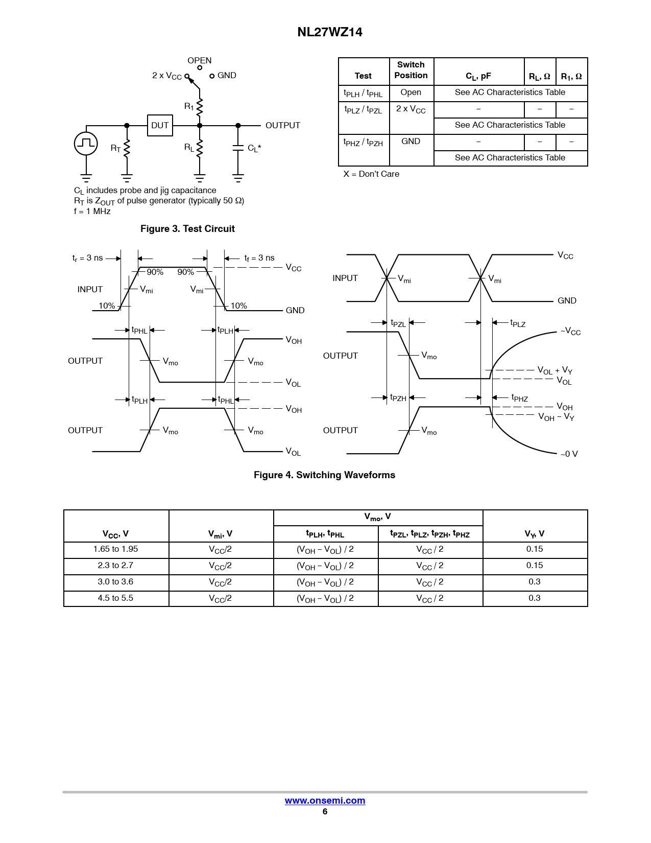 NL27WZ14. Switch. Test. Position. CL, pF. RL, W R1, W. Figure 3. Test Circuit. Figure 4. Switching Waveforms. Vmo, V. VCC, V. Vmi, V